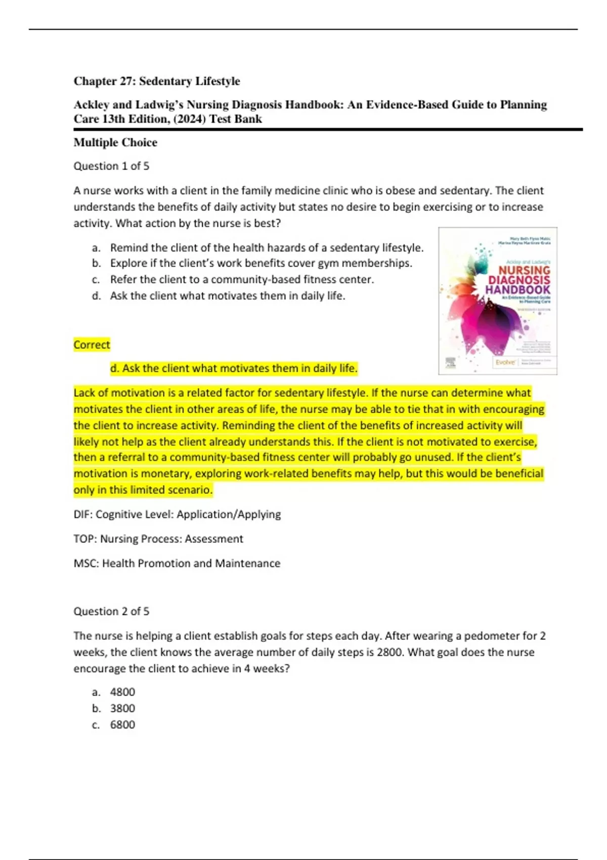 Ackley and Ladwig’s Nursing Diagnosis Handbook: An Evidence-Based Guide to Planning Care 13th Edition Test Bank Chapter 27 Sedentary Lifestyle