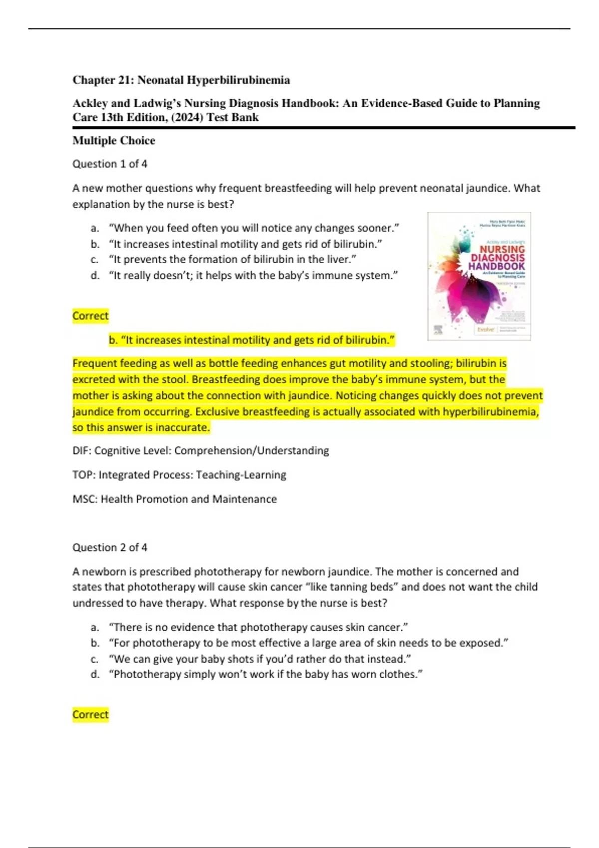 Ackley and Ladwig’s Nursing Diagnosis Handbook: An Evidence-Based Guide to Planning Care 13th Edition Test Bank Chapter 21 Neonatal Hyperbilirubinemia.