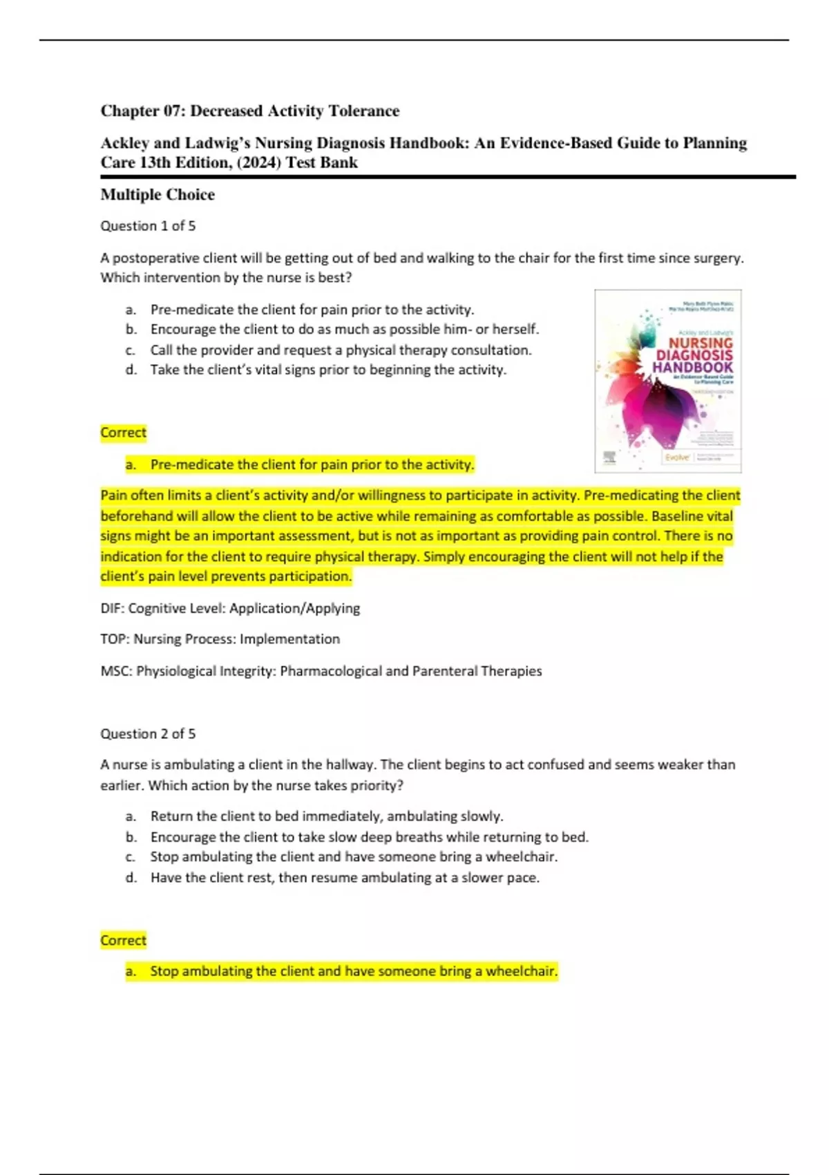 Ackley and Ladwig’s Nursing Diagnosis Handbook: An Evidence-Based Guide to Planning Care 13th Edition Test Bank Chapter 07 Decreased Activity Tolerance