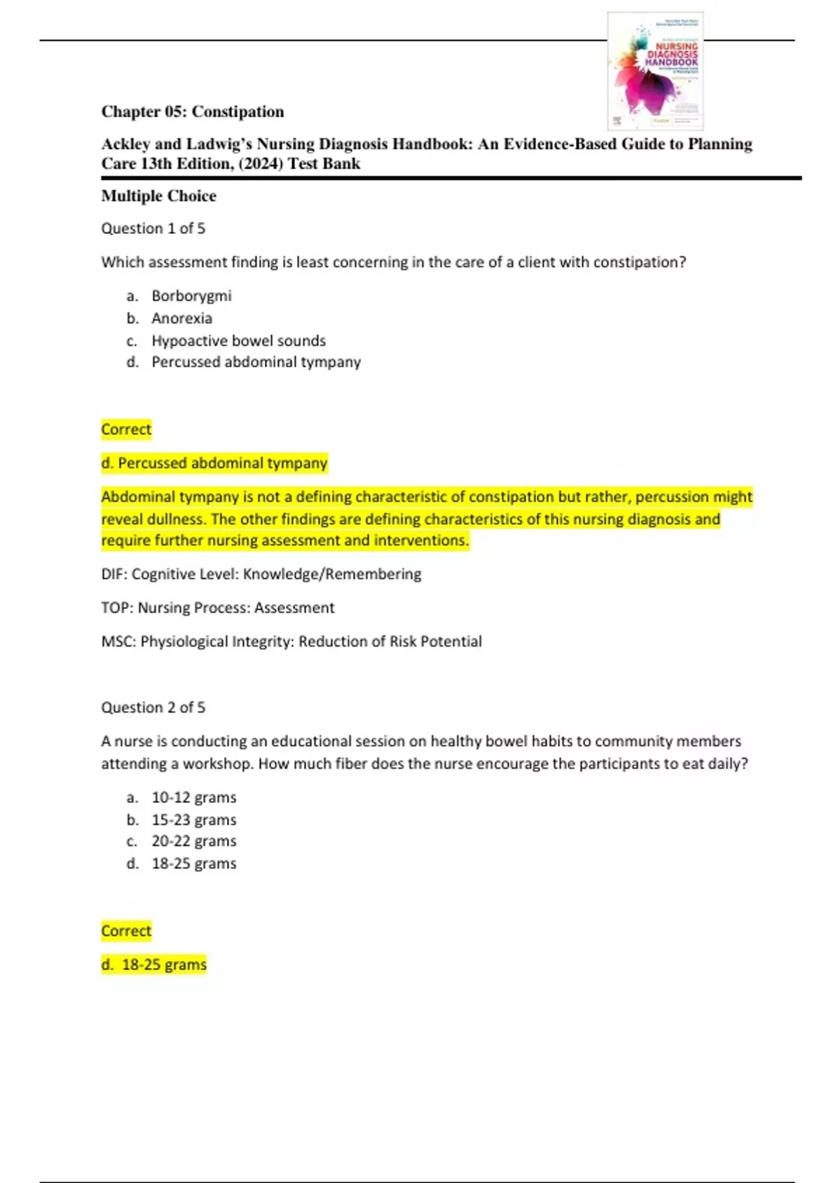 Ackley and Ladwig’s Nursing Diagnosis Handbook: An Evidence-Based Guide to Planning Care 13th Edition Test Bank Chapter 05 Constipation