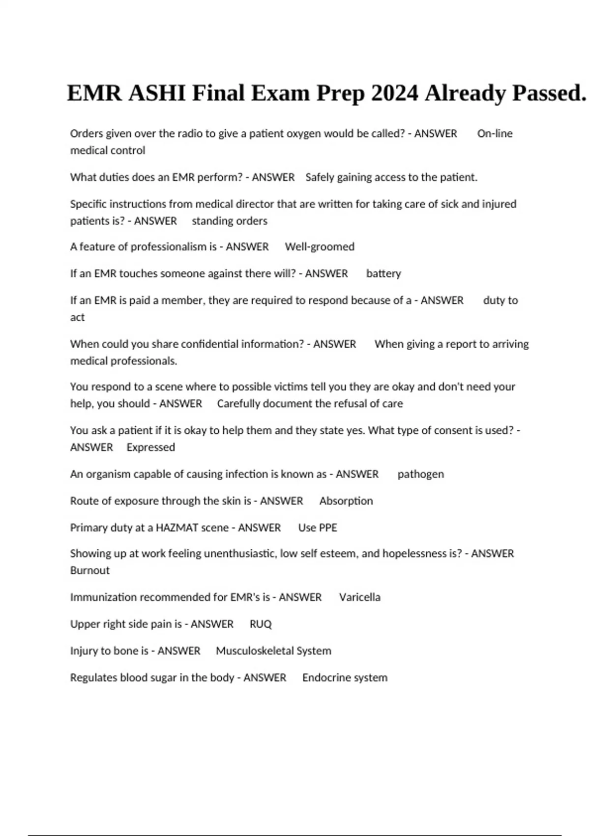 EMR ASHI Final Exam Prep 2024 Already Passed. Orders given over the radio to give a patient oxygen would be called? - ANSWER On-line medical control What duties does an EMR perform? - ANSWER Safely gaining access to the patient. Specific instructions from medical director that are written for taking care of sick and injured patients is? - ANSWER standing orders A feature of professionalism is - ANSWER Well-groomed If an EMR touches someone against there will? - ANSWER battery If an EMR is paid a member, they are required to respond because of a - ANSWER duty to act When could you share confidential information? - ANSWER When giving a report to arriving medical professionals. You respond to a scene where to possible victims tell you they are okay and don't need your help, you should - ANSWER Carefully document the refusal of care You ask a patient if it is okay to help them and they state yes. What type of consent is used? - ANSWER Expressed An organism capable of causing infection is known as - ANSWER pathogen Route of exposure through the skin is - ANSWER Absorption Primary duty at a HAZMAT scene - ANSWER Use PPE Showing up at work feeling unenthusiastic, low self esteem, and hopelessness is? - ANSWER Burnout Immunization recommended for EMR's is - ANSWER Varicella.