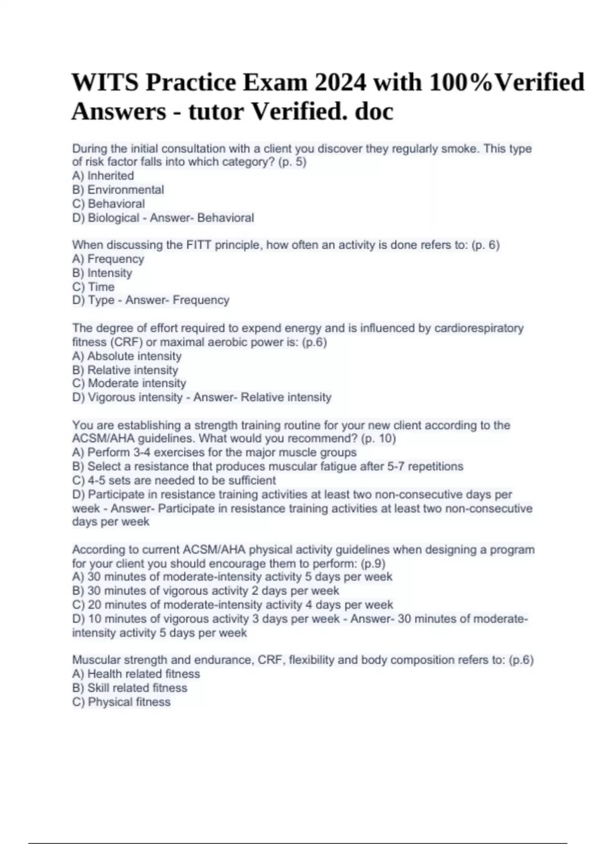 WITS Practice Exam 2024 with 100%Verified Answers - tutor Verified. doc During the initial consultation with a client you discover they regularly smoke. This type of risk factor falls into which category? (p. 5) A) Inherited B) Environmental C) Behavioral D) Biological - Answer- Behavioral When discussing the FITT principle, how often an activity is done refers to: (p. 6) A) Frequency B) Intensity C) Time D) Type - Answer- Frequency The degree of effort required to expend energy and is influenced by cardiorespiratory fitness (CRF) or maximal aerobic power is: (p.6) A) Absolute intensity B) Relative intensity C) Moderate intensity D) Vigorous intensity - Answer- Relative intensity You are establishing a strength training routine for your new client according to the ACSM/AHA guidelines. What would you recommend? (p. 10) A) Perform 3-4 exercises for the major muscle groups B) Select a resistance that produces muscular fatigue after 5-7 repetitions C) 4-5 sets are needed to be sufficient D) Participate in resistance training activities at least two non-consecutive days per week - Answer- Participate in resistance training activities at least two non-consecutive days per week According to current ACSM/AHA physical activity guidelines when designing a program for your client you should encourage them to perform: (p.9) A) 30 minutes of moderate-intensity activity 5 days per week B) 30 minutes of vigorous activity 2 days per week C) 20 minutes of moderate-intensity activity 4 days per week D) 10 minutes of vigorous activity 3 days per week - Answer- 30 minutes of moderateintensity activity 5 days per week Muscular strength and endurance, CRF, flexibility and body composition refers to: (p.6) A) Health related fitness B) Skill related fitness C) Physical fitness WITS Practice Exam 2024 with 100%Verified Answers - tutor Verified. doc D) Exercise fitness - Answer- Health related fitness What is the leading cause of death in the USA? (p. 5) A) Cancers B) Heart disease C) Strokes D) Accidents - Answer- Heart disease Health, fitness, and performance are three distinct goals with separate activity recommendations. You are establishing goals for your client who falls into the performance category. How many days a week should they train? (p.4) A) 4 B) 5 C) 6 D) 7 - Answer- 7 Fitness programming that uses a variety of exercises to simulate routine tasks refers to: (p.13) A) Muscular fitness B) Isometric training C) Functional fitness D) Functional capacity - Answer- Functional fitness While there are many benefits of physical activity there is also a potential for adverse outcomes as well. Your client participates in a contact sport. This falls into which category of risk? (p.11) A) Environment B) Personal factors C) Equipment D) Type of activity - Answer- Type of activity You are designing a strength-training workout for you client. How many exercises for the major muscle groups does ASCM/AHA recomment? A) 8-10 exercises for the major muscle groups B) 3-5 exercises for the major muscle groups C) 2-4 exercises for the major muscle groups D) 5-7 exercises for the major muscle groups - Answer- 8-10 exercises for the major muscle groups ACSM/AHA recommends how many repetitions to maximize strength development when using resistance? A) 4-6 repetitions B) 8-12 repetitions C) 13-15 repetitions D) 16-20 repetitions - Answer- 8-12 repetitions Your client answers "Yes" to one of the seven questions on the Physical Activity Readiness Questionnaire for Everyone. What is the next step? A) They must be referred to a physician before participating in physical activity B) They are ready to be gin physical activity C) They must complete 10 additional questions D) They are ready to begin a moderate physical activity program - Answer- They must complete 10 additional questions Your client is a 49- year-old female who quit smoking 5 months ago and has a waist measurement of 30 inches. Which factor puts her at risk for cardiovascular disease? A) Age B) Gender C) Waist measurement D) Quit smoking for 5 months - Answer- Quit smoking for 5 months MR. PLEASE is an acronym used for the recommended health risk appraisal categories. The "S" in the acronym is when the personal fitness trainer: A) Sets up an exercise prescription B) Seeks the clients medical history C) Starts fitness tests D) Seeks medical clearance - Answer- Sets up an exercise prescription Upon reviewing your potential clients health history you find the he has been taking medicine for high cholesterol but did not indicate he had high cholesterol. He states because of the medication he does not have high cholesterol. What is the next step? A) Ask him to obtain medical clearance B) Have him redo the HSQ C) Note that he has a risk factor of high cholesterol D) Have him redo the PAR-Q+ - Answer- Note that he has a risk factor of high cholesterol .