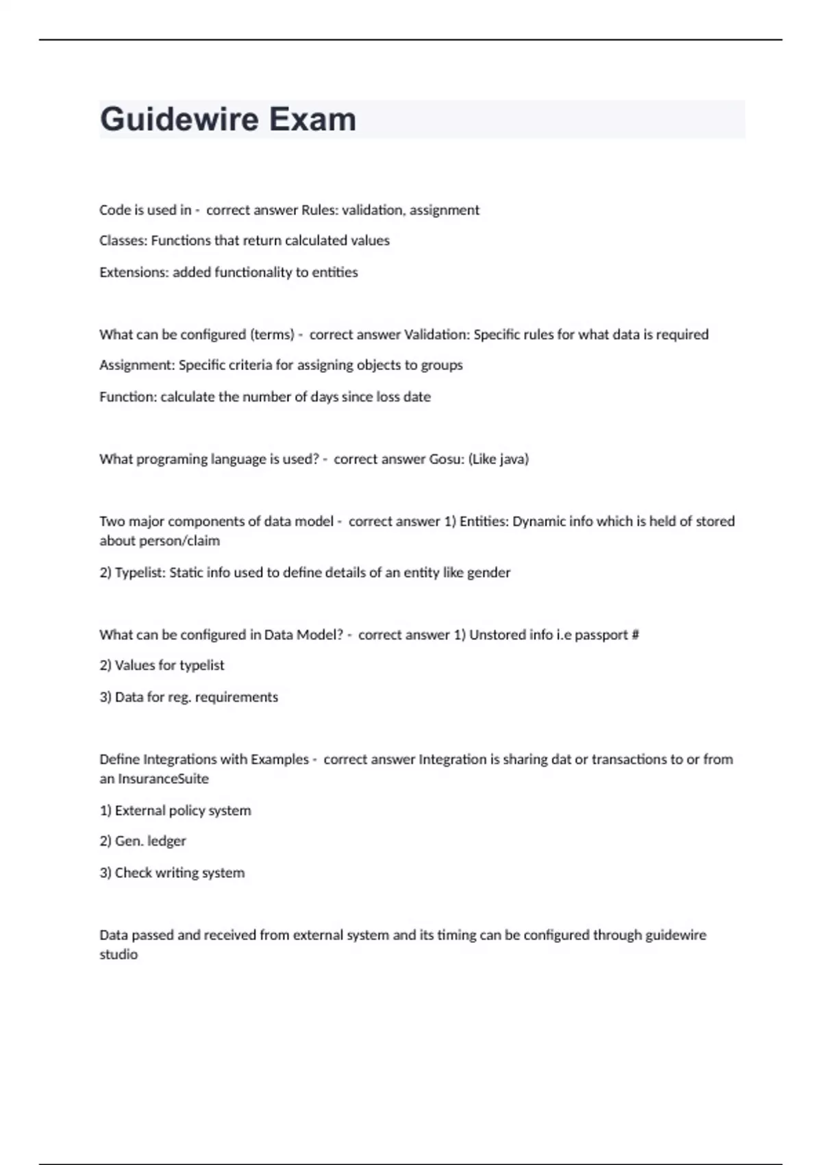 Guidewire Exam Question and answers 100% correct Guidewire Exam Code is used in - correct answer Rules: validation, assignment Classes: Functions that return calculated values Extensions: added functionality to entities What can be configured (terms) - correct answer Validation: Specific rules for what data is required Assignment: Specific criteria for assigning objects to groups Function: calculate the number of days since loss date What programing language is used? - correct answer Gosu: (Like java) Two major components of data model - correct answer 1) Entities: Dynamic info which is held of stored about person/claim 2) Typelist: Static info used to define details of an entity like gender What can be configured in Data Model? - correct answer 1) Unstored info i.e passport # 2) Values for typelist 3) Data for reg. requirements Define Integrations with Examples - correct answer Integration is sharing dat or transactions to or from an InsuranceSuite 1) External policy system 2) Gen. ledger 3) Check writing system Data passed and received from external