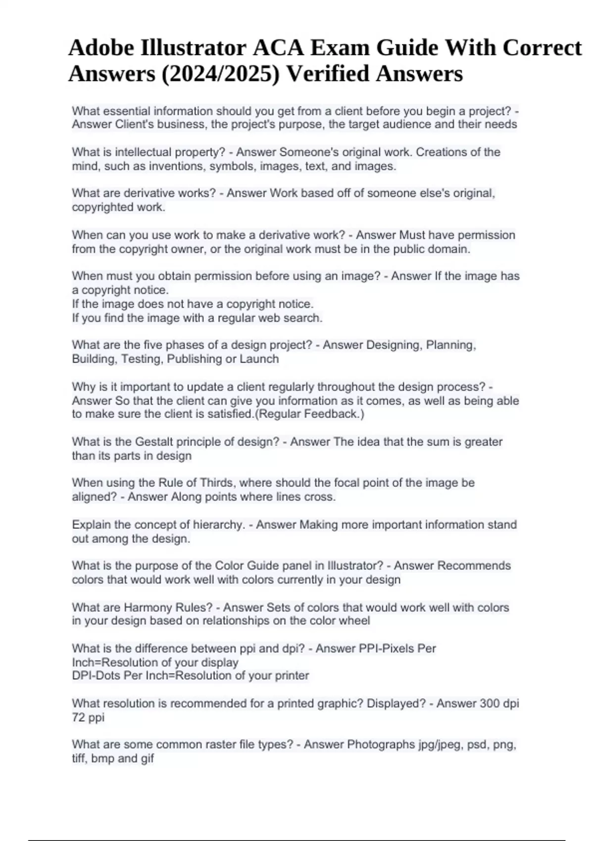 Adobe Illustrator ACA Exam Guide With Correct Answers (2024/2025) Verified Answers. What essential information should you get from a client before you begin a project? - Answer Client's business, the project's purpose, the target audience and their needs What is intellectual property? - Answer Someone's original work. Creations of the mind, such as inventions, symbols, images, text, and images. What are derivative works? - Answer Work based off of someone else's original, copyrighted work. When can you use work to make a derivative work? - Answer Must have permission from the copyright owner, or the original work must be in the public domain. When must you obtain permission before using an image? - Answer If the image has a copyright notice. If the image does not have a copyright notice. If you find the image with a regular web search. What are the five phases of a design project? - Answer Designing, Planning, Building, Testing, Publishing or Launch Why is it important to update a client regularly throughout the design process? - Answer So that the client can give you information as it comes, as well as being able to make sure the client is satisfied.(Regular Feedback.) What is the Gestalt principle of design? - Answer The idea that the sum is greater than its parts in design When using the Rule of Thirds, where should the focal point of the image be aligned? - Answer Along points where lines cross. Explain the concept of hierarchy. - Answer Making more important information stand out among the design. What is the purpose of the Color Guide panel in Illustrator? - Answer Recommends colors that would work well with colors currently in your design What are Harmony Rules? - Answer Sets of colors that would work well with colors in your design based on relationships on the color wheel What is the difference between ppi and dpi? - Answer PPI-Pixels Per Inch=Resolution of your display DPI-Dots Per Inch=Resolution of your printer What resolution is recommended for a printed graphic? Displayed? - Answer 300 dpi 72 ppi What are some common raster file types? - Answer Photographs jpg/jpeg, psd, png, tiff, bmp and gif.