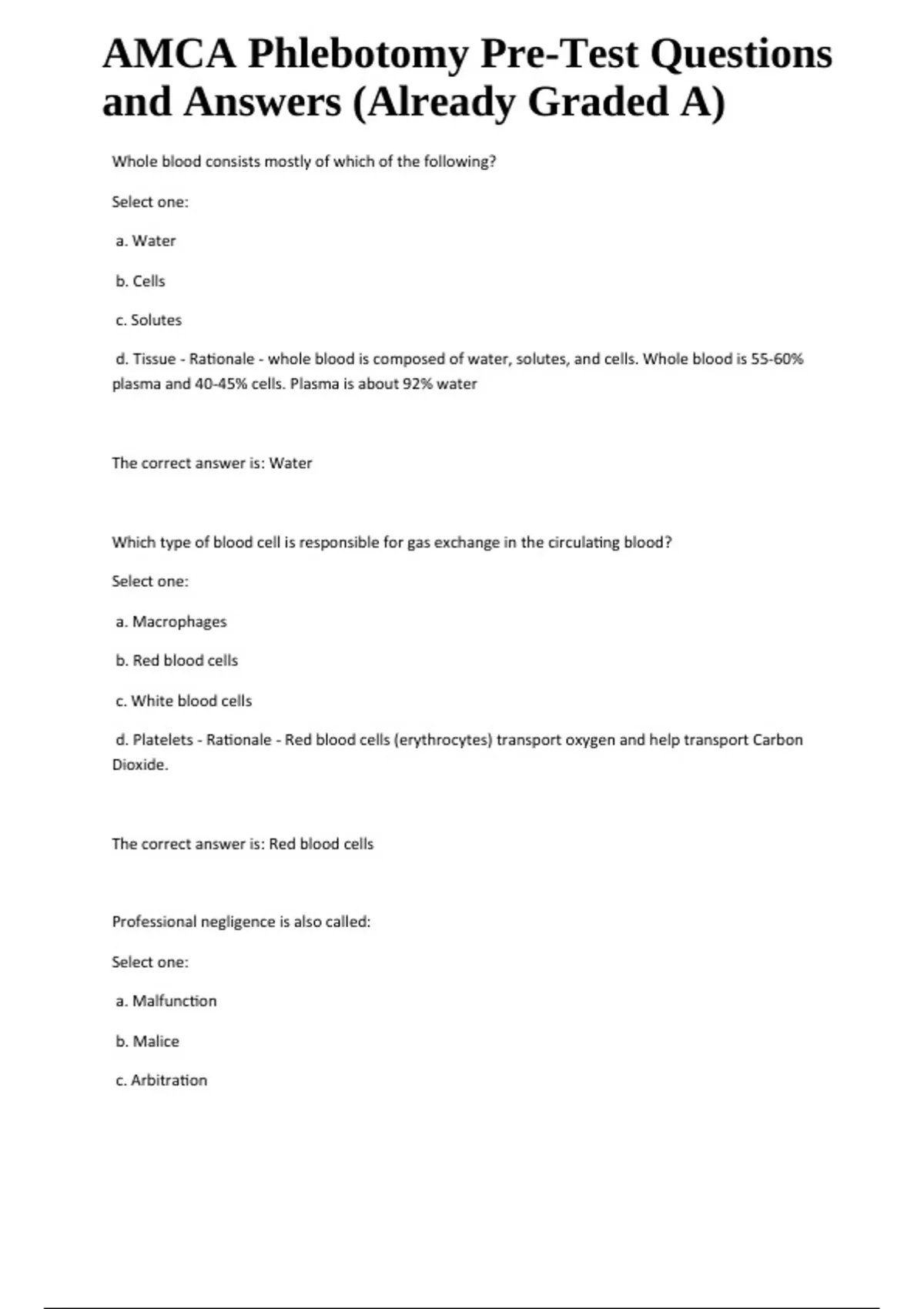 AMCA Phlebotomy Pre-Test Questions and Answers (Already Graded A) Whole blood consists mostly of which of the following? Select one: a. Water b. Cells c. Solutes d. Tissue - Rationale - whole blood is composed of water, solutes, and cells. Whole blood is 55-60% plasma and 40-45% cells. Plasma is about 92% water The correct answer is: Water Which type of blood cell is responsible for gas exchange in the circulating blood? Select one: a. Macrophages b. Red blood cells c. White blood cells d. Platelets - Rationale - Red blood cells (erythrocytes) transport oxygen and help transport Carbon Dioxide. The correct answer is: Red blood cells Professional negligence is also called: Select one: a. Malfunction b. Malice c. Arbitration AMCA Phlebotomy Pre-Test Questions and Answers (Already Graded A) d. Malpractice - Rationale - Malpractice is a form of professional negligence The correct answer is: Malpractice Which of the following items is the most important for phlebotomists to keep in mind during their daily routine in medical settings? Select one: a. Consent b. Burglary c. Privilege granted to a physician d. Confidentiality - Rationale - Patient confidentiality is the most important part of the health care industry. The correct answer is: Confidentiality Which department performs chemical screening tests on urine specimens? Select one: a. Coagulation b. Microbiology c. Urinalysis d. Hematology - Rationale - The urinalysis department performs chemical screening on urine specimens as part of a urinalysis test The correct answer is: Urinalysis Which department monitors warfarin therapy? Select one: a. Immunology b. Chemistry c. Microbiology d. Coagulation - Rationale - Warfarin is an anticoagulant and is monitored closely by the prothrombin time test which is performed in the coagulation department The correct answer is: Coagulation Which type of blood cell is responsible for defense and immunity? Select one: a. Macrophages b. Red blood cells c. Platelets d. White blood cells - Rationale - Leukocytes (white blood cells) are responsible for defense and immunity The correct answer is: White blood cells The liquid portion of a blood specimen (without an anticoagulant) is called: Select one: a. Serum b. Oxygenated blood c. Cellular components d. Plasma - Rationale - Plasma is the liquid portion of blood The correct answer is: Serum.