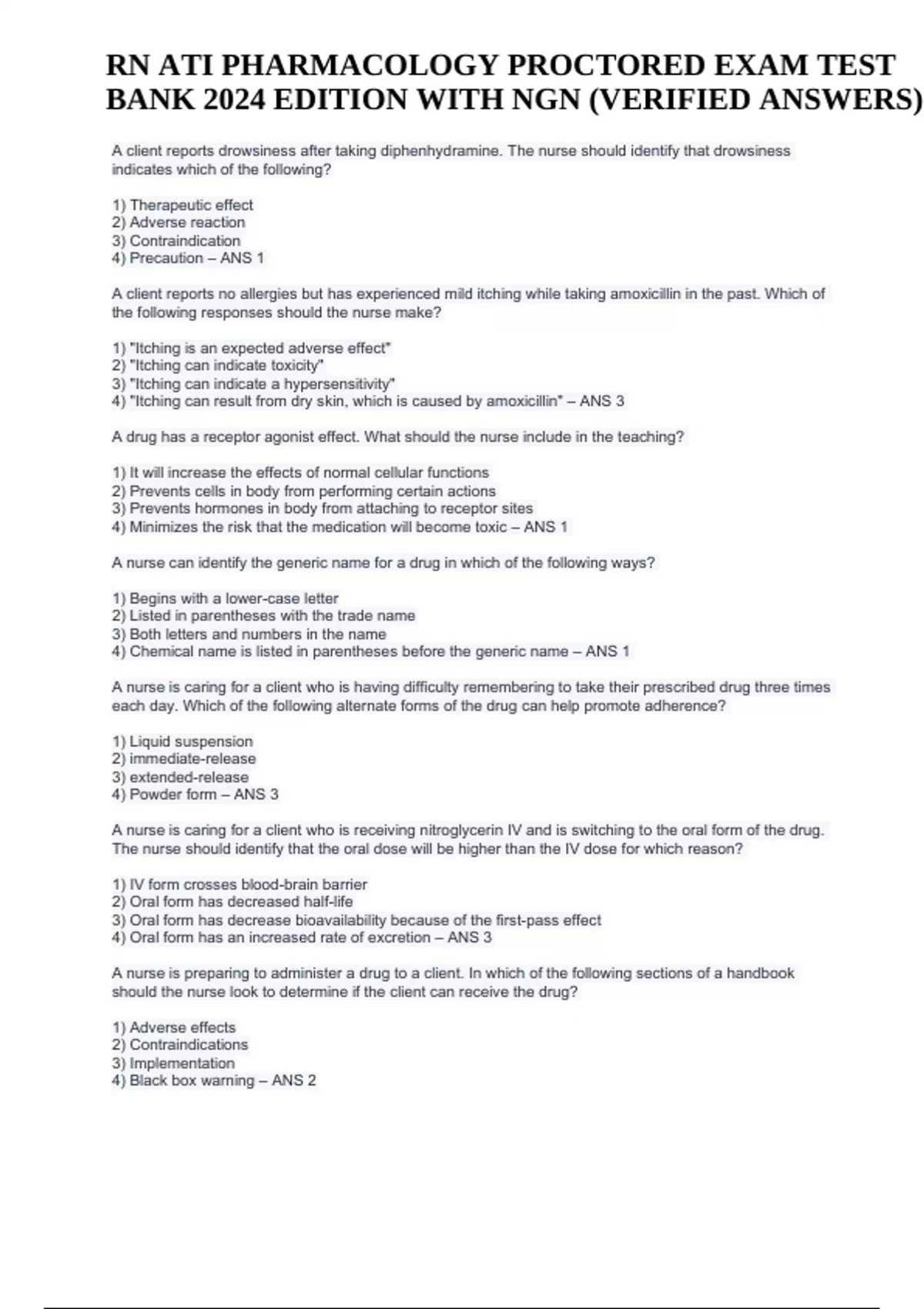RN ATI PHARMACOLOGY PROCTORED EXAM TEST BANK 2024 EDITION WITH NGN (VERIFIED ANSWERS). A client reports drowsiness after taking diphenhydramine. The nurse should identify that drowsiness indicates which of the following? 1) Therapeutic effect 2) Adverse reaction 3) Contraindication 4) Precaution – ANS 1 A client reports no allergies but has experienced mild itching while taking amoxicillin in the past. Which of the following responses should the nurse make? 1) "Itching is an expected adverse effect" 2) "Itching can indicate toxicity" 3) "Itching can indicate a hypersensitivity" 4) "Itching can result from dry skin, which is caused by amoxicillin" – ANS 3 A drug has a receptor agonist effect. What should the nurse include in the teaching? 1) It will increase the effects of normal cellular functions 2) Prevents cells in body from performing certain actions 3) Prevents hormones in body from attaching to receptor sites 4) Minimizes the risk that the medication will become toxic – ANS 1 A nurse can identify the generic name for a drug in which of the following ways? 1) Begins with a lower-case letter 2) Listed in parentheses with the trade name 3) Both letters and numbers in the name 4) Chemical name is listed in parentheses before the generic name – ANS 1 A nurse is caring for a client who is having difficulty remembering to take their prescribed drug three times each day. Which of the following alternate forms of the drug can help promote adherence? 1) Liquid suspension 2) immediate-release 3) extended-release 4) Powder form – ANS 3 A nurse is caring for a client who is receiving nitroglycerin IV and is switching to the oral form of the drug. The nurse should identify that the oral dose will be higher than the IV dose for which reason? 1) IV form crosses blood-brain barrier 2) Oral form has decreased half-life 3) Oral form has decrease bioavailability because of the first-pass effect 4) Oral form has an increased rate of excretion – ANS 3 A nurse is preparing to administer a drug to a client. In which of the following sections of a handbook should the nurse look to determine if the client can receive the drug? 1) Adverse effects 2) Contraindications 3) Implementation 4) Black box warning – ANS 2.