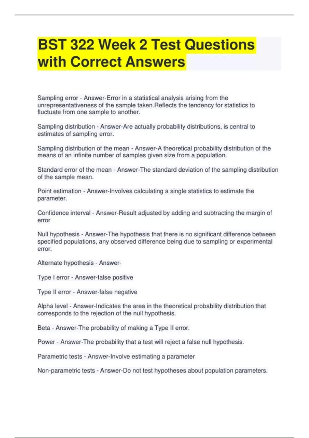 BST 322 Week 2 Test Questions with Correct Answers Sampling error - Answer-Error in a statistical analysis arising from the unrepresentativeness of the sample taken.Reflects the tendency for statistics to fluctuate from one sample to another. Sampling distribution - Answer-Are actually probability distributions, is central to estimates of sampling error. Sampling distribution of the mean - Answer-A theoretical probability distribution of the means of an infinite number of samples given size from a population. Standard error of the mean - Answer-The standard deviation of the sampling distribution of the sample mean. Point estimation - Answer-Involves calculating a single statistics to estimate the parameter. Confidence interval - Answer-Result adjusted by adding and subtracting the margin of error Null hypothesis - Answer-The hypothesis that there is no significant difference between specified populations, any observed difference being due to sampling or experimental error. Alternate hypothesis - Answer- Type I error - Answer-false positive Type II error - Answer-false negative Alpha level - Answer-Indicates the area in the theoretical probability distribution that corresponds to the rejection of the null hypothesis. Beta - Answer-The probability of making a Type II error. Power - Answer-The probability that a test will reject a false null hypothesis. Parametric tests - Answer-Involve estimating a parameter Non-parametric tests - Answer-Do not test hypotheses about population parameters. One-tailed test - Answer-Is one in which the critical region is in only one end of the distribution. Two-tailed test - Answer-Is one that uses both tails of a sampling distribution to determine the critical region for rejecting the null hypothesis. Critical region - Answer-Acceptance region on the theoretical distribution, and to accept the null hypothesis otherwise. Degrees of freedom - Answer-Is a concept used in statistical testing to indicate the number of components that are free to vary about a parameter. One-sample t-test - Answer- Standard error of the difference - Answer-SEd summarizes how much sampling error occurs, on average, when a mean difference score is computed, for samples of a given size. Independent groups t-test - Answer-Is used when the participants in the two groups are not the same people, nor connected to one another in a systematic way. Paired t-test - Answer-(Dependent group t test or correlated groups t test) Point biserial correlation - Answer- Analysis of Variance (ANOVA) - Answer-Is used to draw inferences about differences among population means. Between-group varaiance - Answer-Differences between groups Within-group variance - Answer-Differences between people in the groups F ratio - Answer-I Sum of squares - Answer-The sum of the square deviations around a mean. One-Way ANOVA - Answer-There is a single independent variable whole effect on a dependent variable is under study. Multifactorial ANOVA - Answer-When the effects of two or more independent variables on a dependent variable are studied simultaneously.
