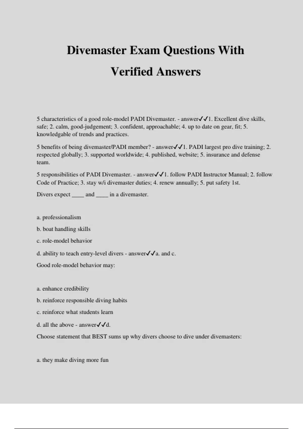 Divemaster Exam Questions With Verified Answers 5 characteristics of a good role-model PADI Divemaster. - answer1. Excellent dive skills, safe; 2. calm, good-judgement; 3. confident, approachable; 4. up to date on gear, fit; 5. knowledgable of trends and practices. 5 benefits of being divemaster/PADI member? - answer1. PADI largest pro dive training; 2. respected globally; 3. supported worldwide; 4. published, website; 5. insurance and defense team. 5 responsibilities of PADI Divemaster. - answer1. follow PADI Instructor Manual; 2. follow Code of Practice; 3. stay w/i divemaster duties; 4. renew annually; 5. put safety 1st. Divers expect ____ and ____ in a divemaster. a. professionalism b. boat handling skills c. role-model behavior d. ability to teach entry-level divers - answera. and c. Good role-model behavior may: a. enhance credibility b. reinforce responsible diving habits c. reinforce what students learn d. all the above - answerd. Choose statement that BEST sums up why divers choose to dive under divemasters: a. they make diving more fun b. they have authority to revoke certifications c. they will handle every detail of diver's plans d. they are required to be there - answera. A mentor relationship between you and the instructor means: a. you'll be on your own b. instructor is interested in what you think and why c. your role will be to mentor other candidates d. none of the abve - answerb. T or F. One way additional training helps you gain experience is by providing dive opportunities. - answerTrue. In dive planning for a group of certified divers, your role is to: a. plan dives for each buddy team b. provide broad planning info that divers use to plan their own dives c. do little or nothing unless asked d. only tell everyone when to be back aboard. - answerb. Divers must retain responsibility for: a. planning dives within their own limits b. following those plans c. revising plans if conditions change during the dive. d. none of the above - answera., b., c. T or F. "Thinking through the dive" (from before it starts to after it ends) is the best way to prepare for a dive. - answerTrue. T or F. Rain can affect dive conditions by causing current, temperature change and/or visibility changes. - answerFalse. Wind (not rain) can cause all three of those changes. Rain won't affect currents usually. When planning for dives in remote areas, planning must consider: