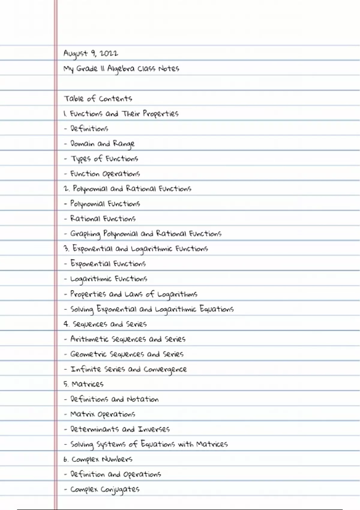 This document contains my Grade 11 Algebra Class Notes 7 Pages in pdf format. Here is table of contents: Table of Contents 1. Functions and Their Properties - Definitions - Domain and Range - Types of Functions - Function Operations 2. Polynomial and Rational Functions - Polynomial Functions - Rational Functions - Graphing Polynomial and Rational Functions 3. Exponential and Logarithmic Functions - Exponential Functions - Logarithmic Functions - Properties and Laws of Logarithms - Solving Exponential and Logarithmic Equations 4. Sequences and Series - Arithmetic Sequences and Series - Geometric Sequences and Series - Infinite Series and Convergence 5. Matrices - Definitions and Notation - Matrix Operations - Determinants and Inverses - Solving Systems of Equations with Matrices 6. Complex Numbers - Definition and Operations - Complex Conjugates - Polar Form and De Moivre’s Theorem 7. Conic Sections - Parabolas - Ellipses - Hyperbolas - Identifying and Graphing Conic Sections 8. Trigonometry - Trigonometric Functions and Their Graphs - Trigonometric Identities and Equations - Law of Sines and Cosines - Applications of Trigonometry