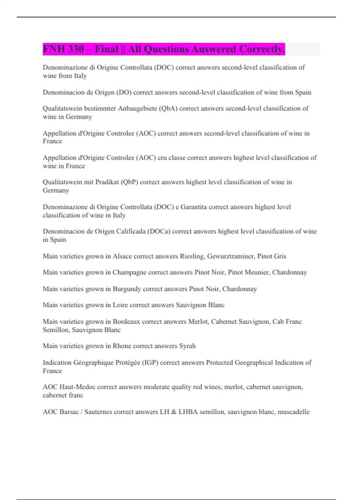 Denominazione di Origine Controllata (DOC) correct answers second-level classification of wine from Italy Denominacion de Origen (DO) correct answers second-level classification of wine from Spain Qualitatswein bestimmter Anbaugebiete (QbA) correct answers second-level classification of wine in Germany Appellation d'Origine Controlee (AOC) correct answers second-level classification of wine in France Appellation d'Origine Controlee (AOC) cru classe correct answers highest level classification of wine in France Qualitatswein mit Pradikat (QbP) correct answers highest level classification of wine in Germany Denominazione di Origine Controllata (DOC) e Garantita correct answers highest level classification of wine in Italy Denominacion de Origen Calificada (DOCa) correct answers highest level classification of wine in Spain Main varieties grown in Alsace correct answers Riesling, Gewurztraminer, Pinot Gris Main varieties grown in Champagne correct answers Pinot Noir, Pinot Meunier, Chardonnay Main varieties grown in Burgundy correct answers Pinot Noir, Chardonnay Main varieties grown in Loire correct answers Sauvignon Blanc Main varieties grown in Bordeaux correct answers Merlot, Cabernet Sauvignon, Cab Franc Semillon, Sauvignon Blanc Main varieties grown in Rhone correct answers Syrah Indication Géographique Protégée (IGP) correct answers Protected Geographical Indication of France AOC Haut-Medoc correct answers moderate quality red wines; merlot, cabernet sauvignon, cabernet franc AOC Barsac / Sauternes correct answers LH & LHBA semillon, sauvignon blanc, muscadelle