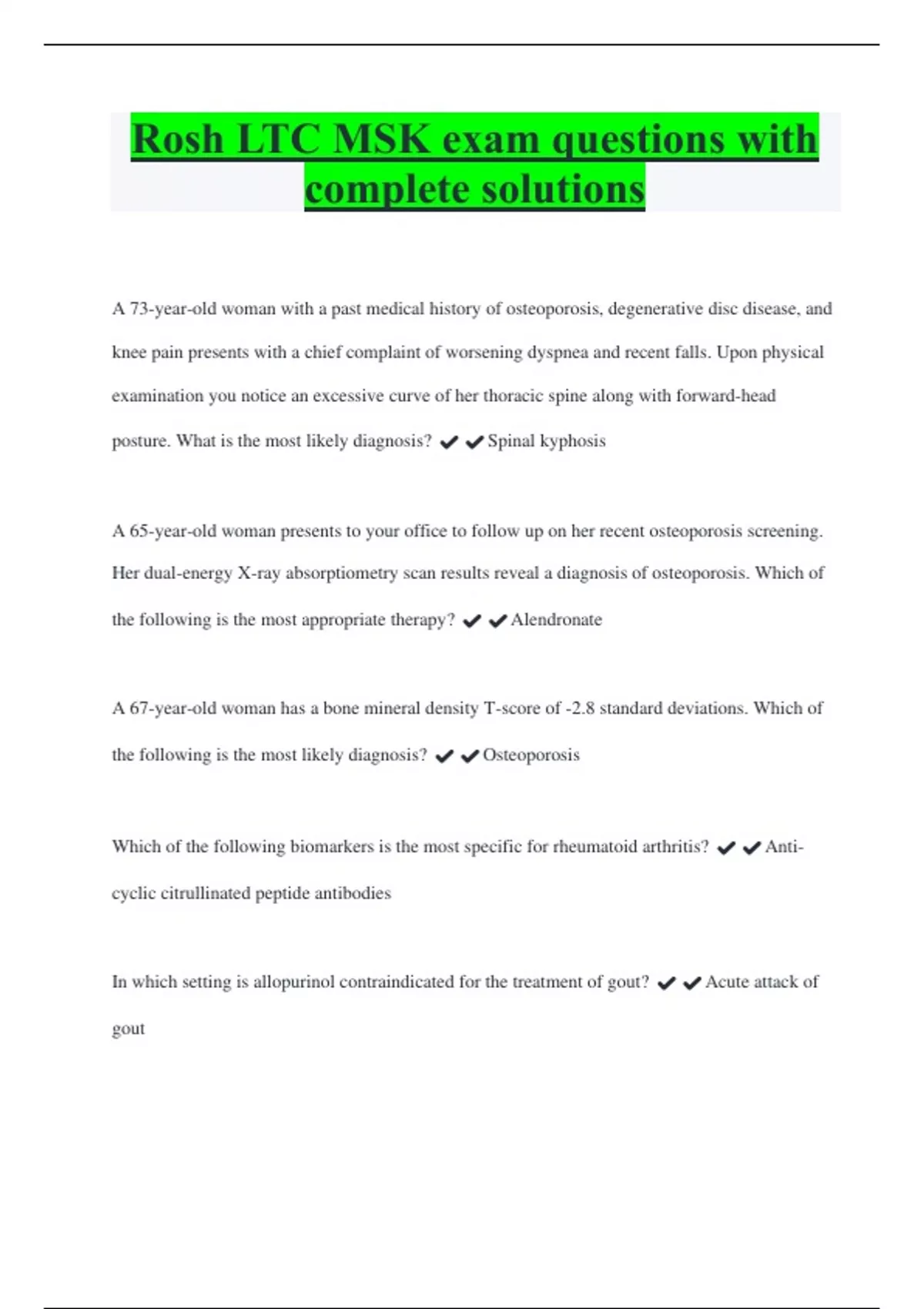 Rosh LTC MSK exam questions with complete solutions A 73-year-old woman with a past medical history of osteoporosis, degenerative disc disease, and knee pain presents with a chief complaint of worsening dyspnea and recent falls. Upon physical examination you notice an excessive curve of her thoracic spine along with forward-head posture. What is the most likely diagnosis? ️️Spinal kyphosis A 65-year-old woman presents to your office to follow up on her recent osteoporosis screening. Her dual-energy X-ray absorptiometry scan results reveal a diagnosis of osteoporosis. Which of the following is the most appropriate therapy? ️️Alendronate
