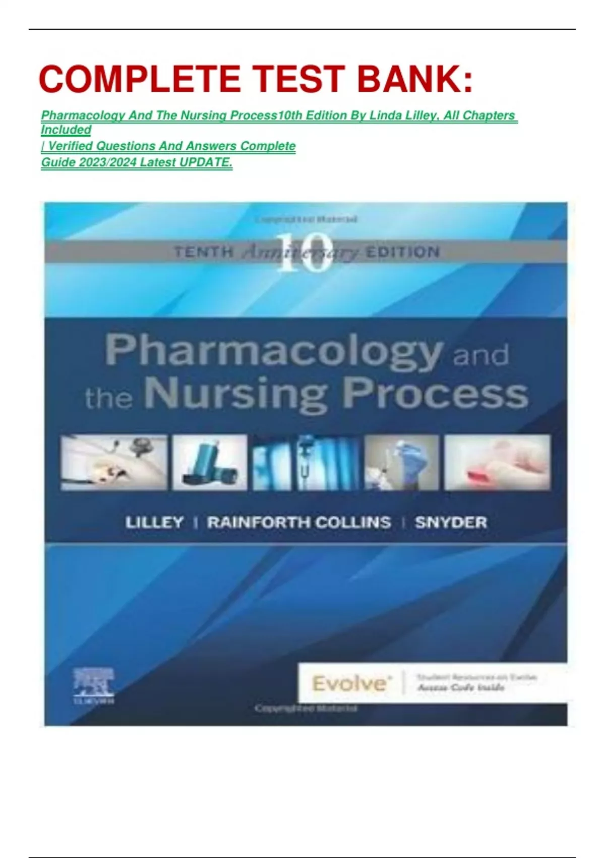 COMPLETE TEST BANK: Pharmacology And The Nursing Process10th Edition By Linda Lilley, All Chapters Included | Verified Questions And Answers Complete Guide 2023/2024 Latest UPDATE.