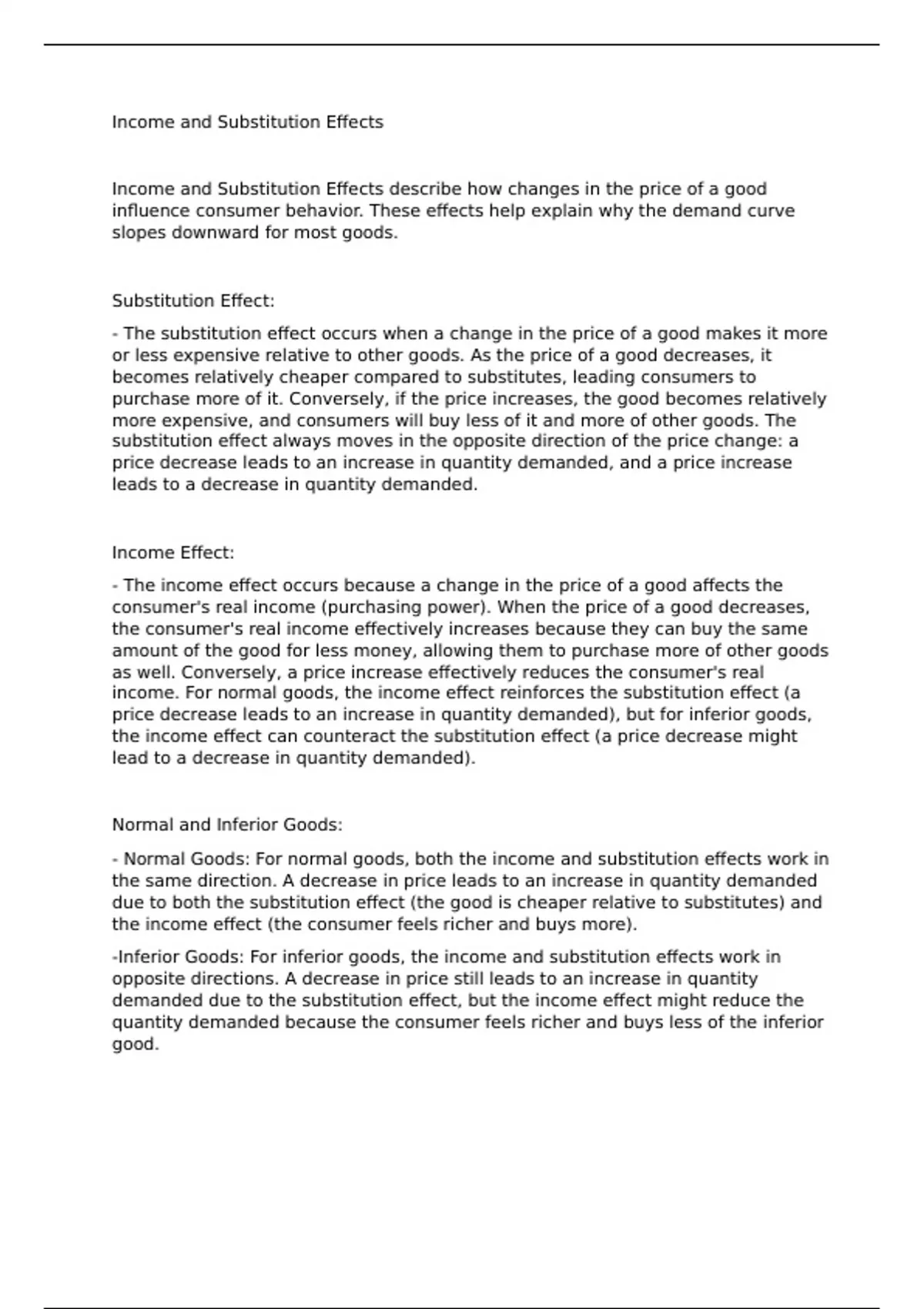-Inferior Goods: For inferior goods, the income and substitution effects work in