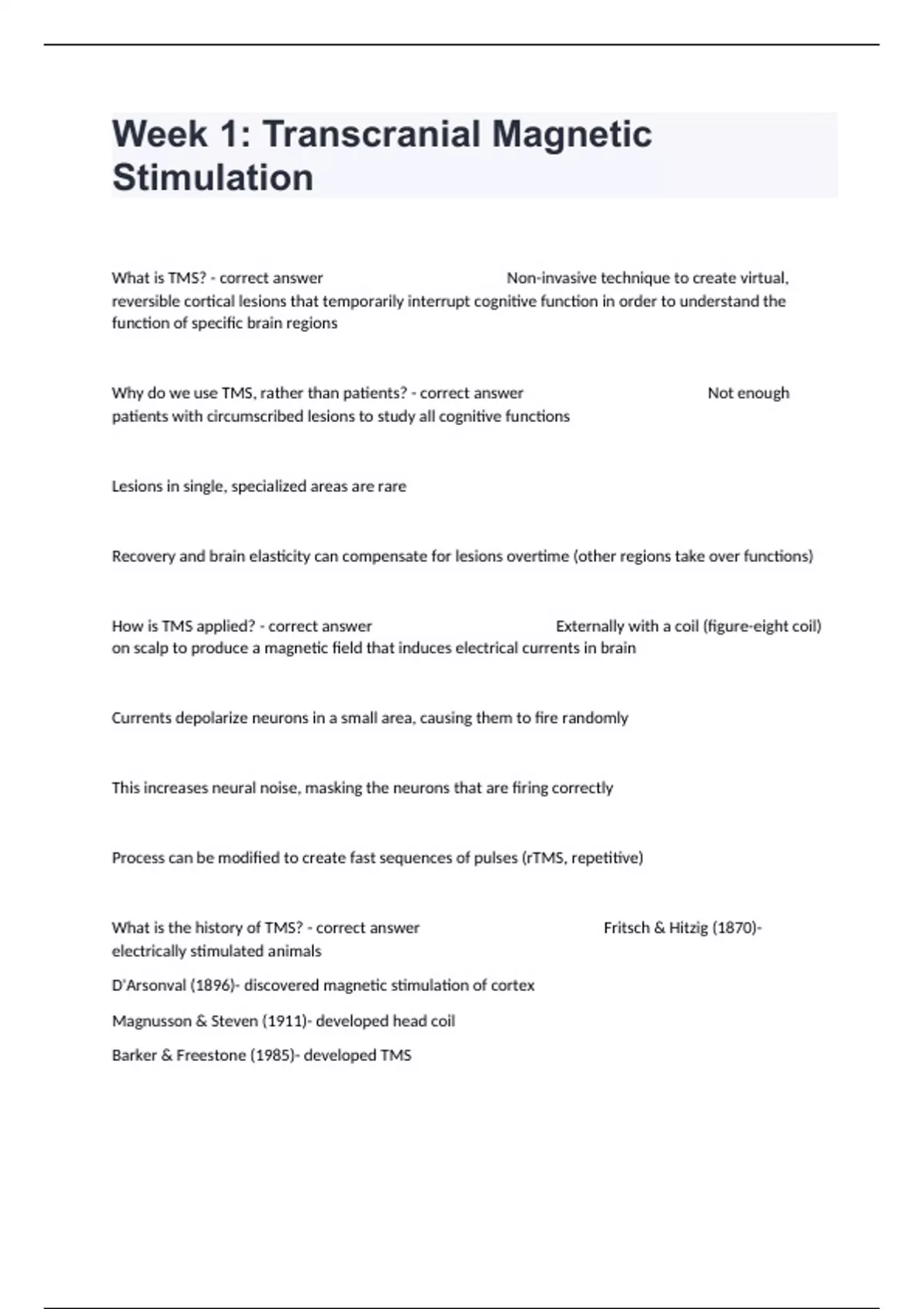 Week 1: Transcranial Magnetic Stimulation Study Guide With Questions Fully Solved.