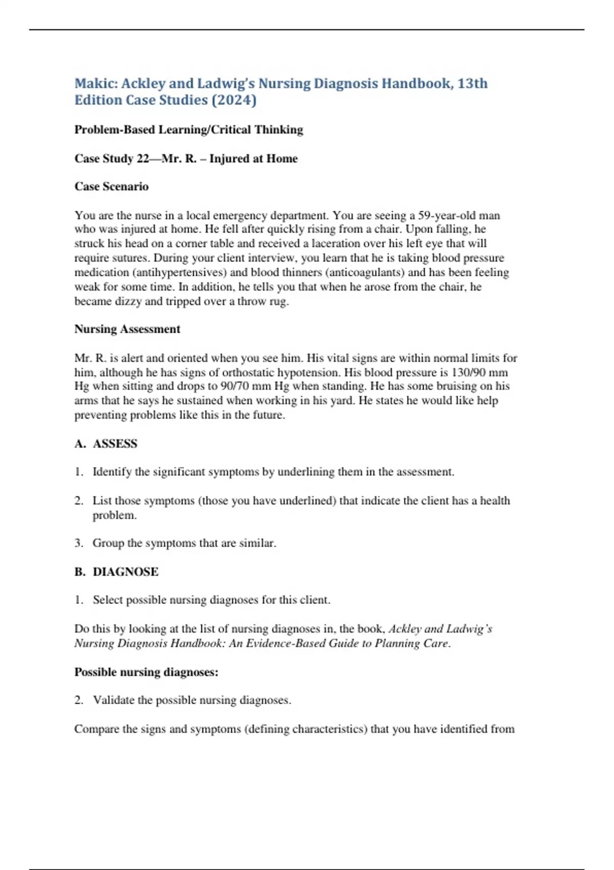 Case Study 22—Mr. R. – Injured at Home With Answers Problem-Based Learning/Critical Thinking Ackley and Ladwig’s Nursing Diagnosis Handbook, 13th Edition Makic (2024)