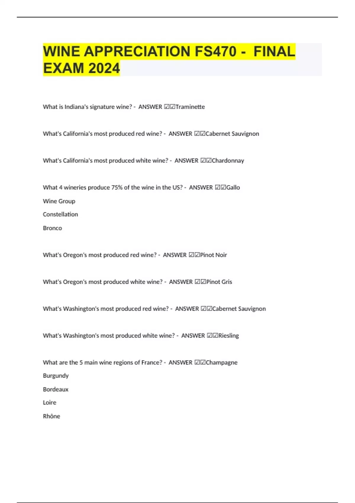 WINE APPRECIATION FS470 - FINAL EXAM 2024