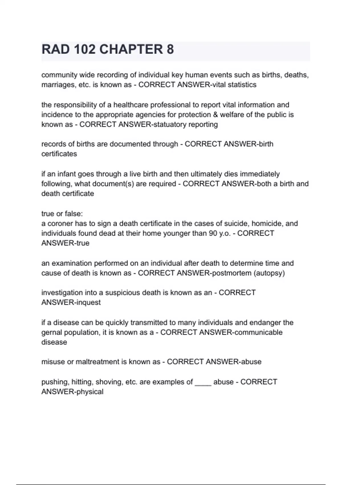 cause of death is known as - CORRECT ANSWER-postmortem (autopsy)
