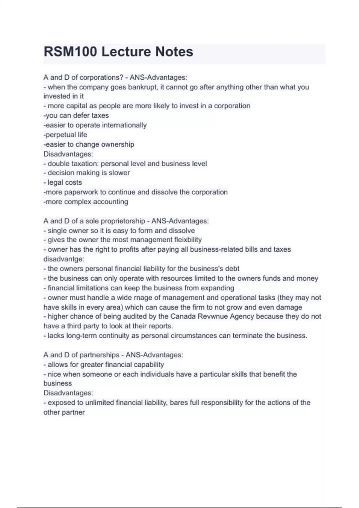 RSM100 Lecture Notes