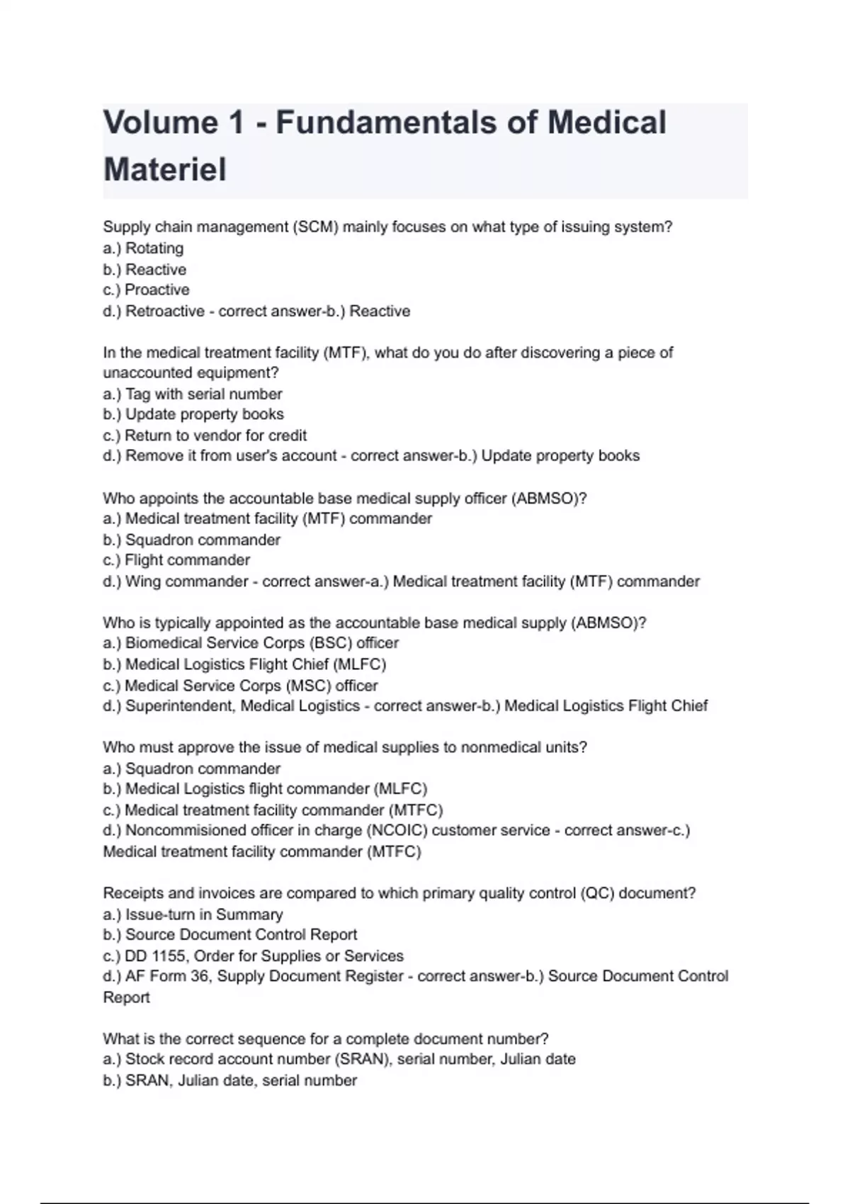 Volume 1 - Fundamentals of Medical Materiel Questions & answers with Complete solutions | Latest edition