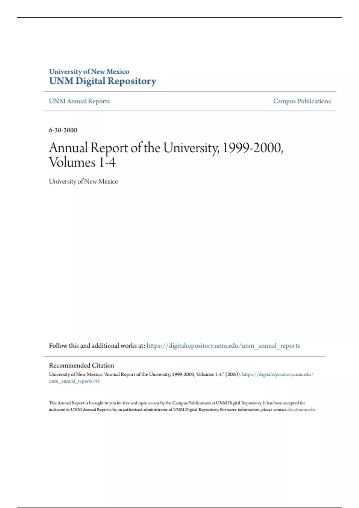 University of New Mexico. "Annual Report of the University, 1999-2000, Volumes 1-4." (2000). https://digitalrepository.unm.edu/