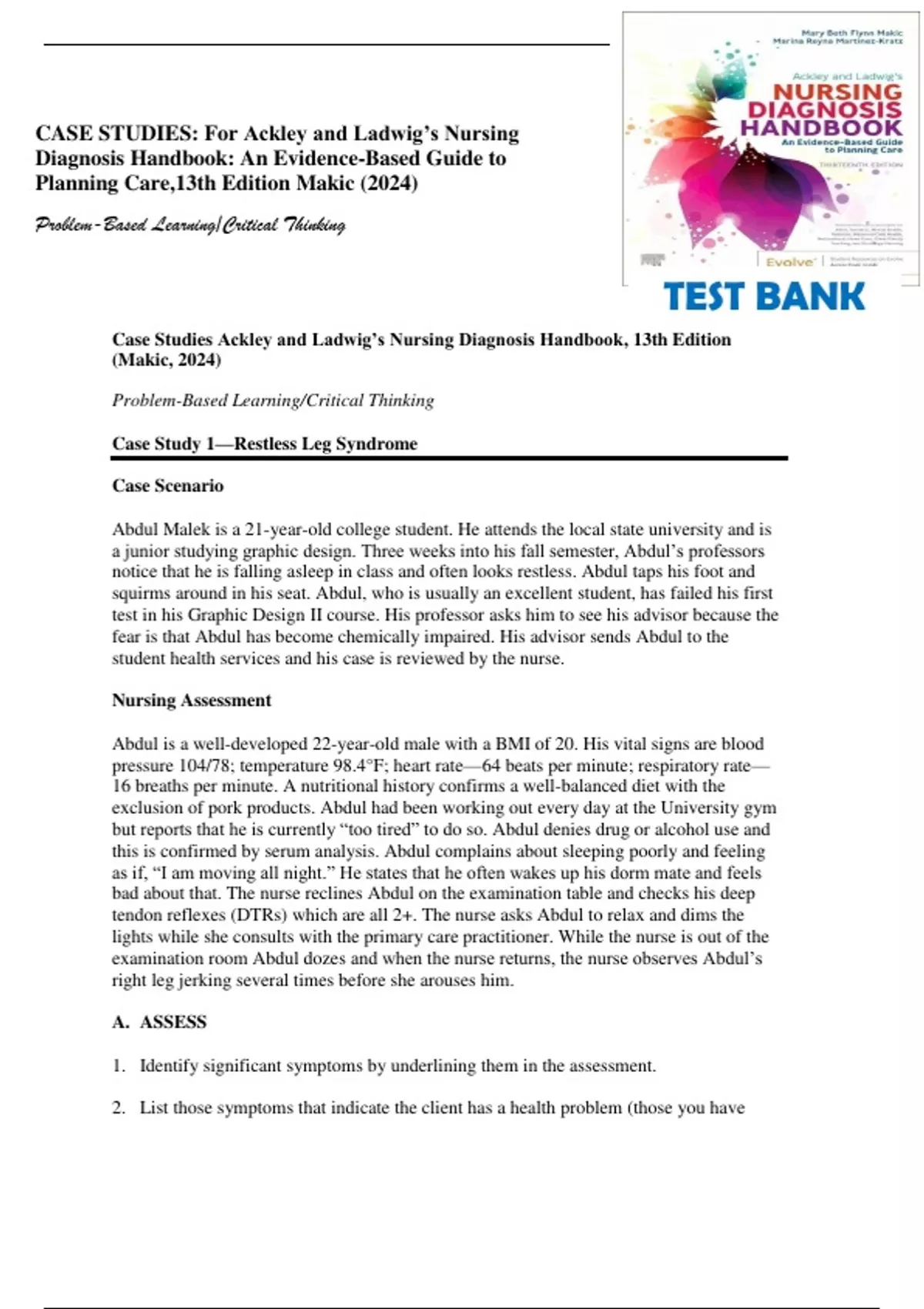 CASE STUDIES: For Ackley and Ladwig’s Nursing Diagnosis Handbook: An Evidence-Based Guide to Planning Care,13th Edition (Makic, 2024) Problem-Based Learning/Critical Thinking