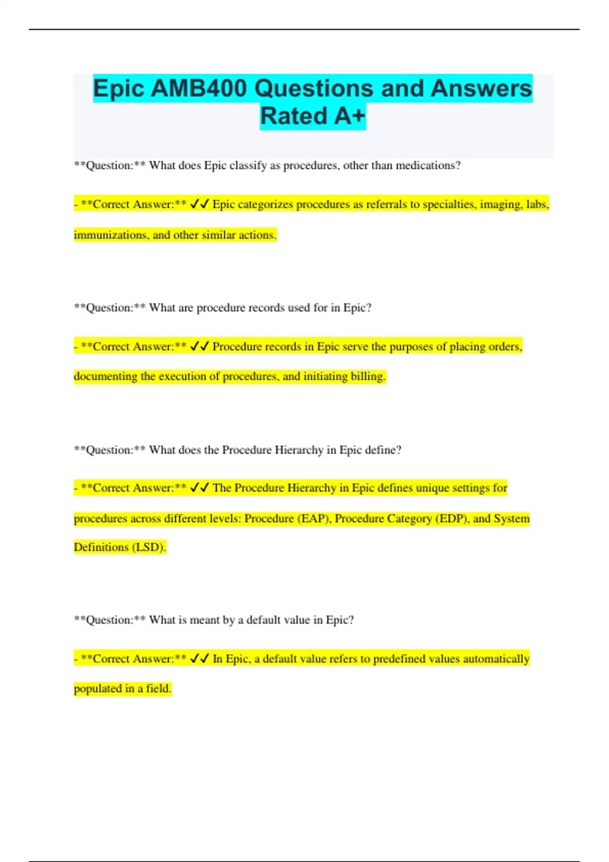 Epic AMB400 Questions and Answers Rated A+ **Question:** What does Epic classify as procedures, other than medications? - **Correct Answer:** Epic categorizes procedures as referrals to specialties, imaging, labs, immunizations, and other similar actions. **Question:** What are procedure records used for in Epic? - **Correct Answer:** Procedure records in Epic serve the purposes of placing orders, documenting the execution of procedures, and initiating billing. **Question:** What does the Procedure Hierarchy in Epic define? - **Correct Answer:** The Procedure Hierarchy in Epic defines unique settings for procedures across different levels: Procedure (EAP), Procedure Category (EDP), and System Definitions (LSD). **Question:** What is meant by a default value in Epic? - **Correct Answer:** In Epic, a default value refers to predefined values automatically populated in a field. **Question:** What role do item buttons play in Epic? - **Correct Answer:** Item buttons in Epic determine the functional buttons located adjacent to a field. **Question:** Where would you specify that all lab orders should have a default Order Class of "Lab" in Epic? - **Options:** - In each lab procedure record. - In the procedure category used for all lab procedures. - In System Definitions. - **Correct Answer:** Option: In the procedure category used for all lab procedures. **Question:** Where should you specify that all procedures should have a default Priority of "Routine" in Epic? - **Options:** - In each procedure record. - In each procedure category. - In System Definitions. - **Correct Answer:** Option: In System Definitions. **True or False:** Can OCC records in Epic be linked to any level in the procedure hierarchy? - **Correct Answer:** True, OCC records can be linked at the Procedure Record (EAP), Procedure Category (EDP), or the Systems Definition (LSD). **Question:** What are controlled items in an Order Composer Configuration (OCC) record in Epic? - **Correct Answer:** Controlled items in an OCC record define fields that are mandatory or recommended in an order composer.