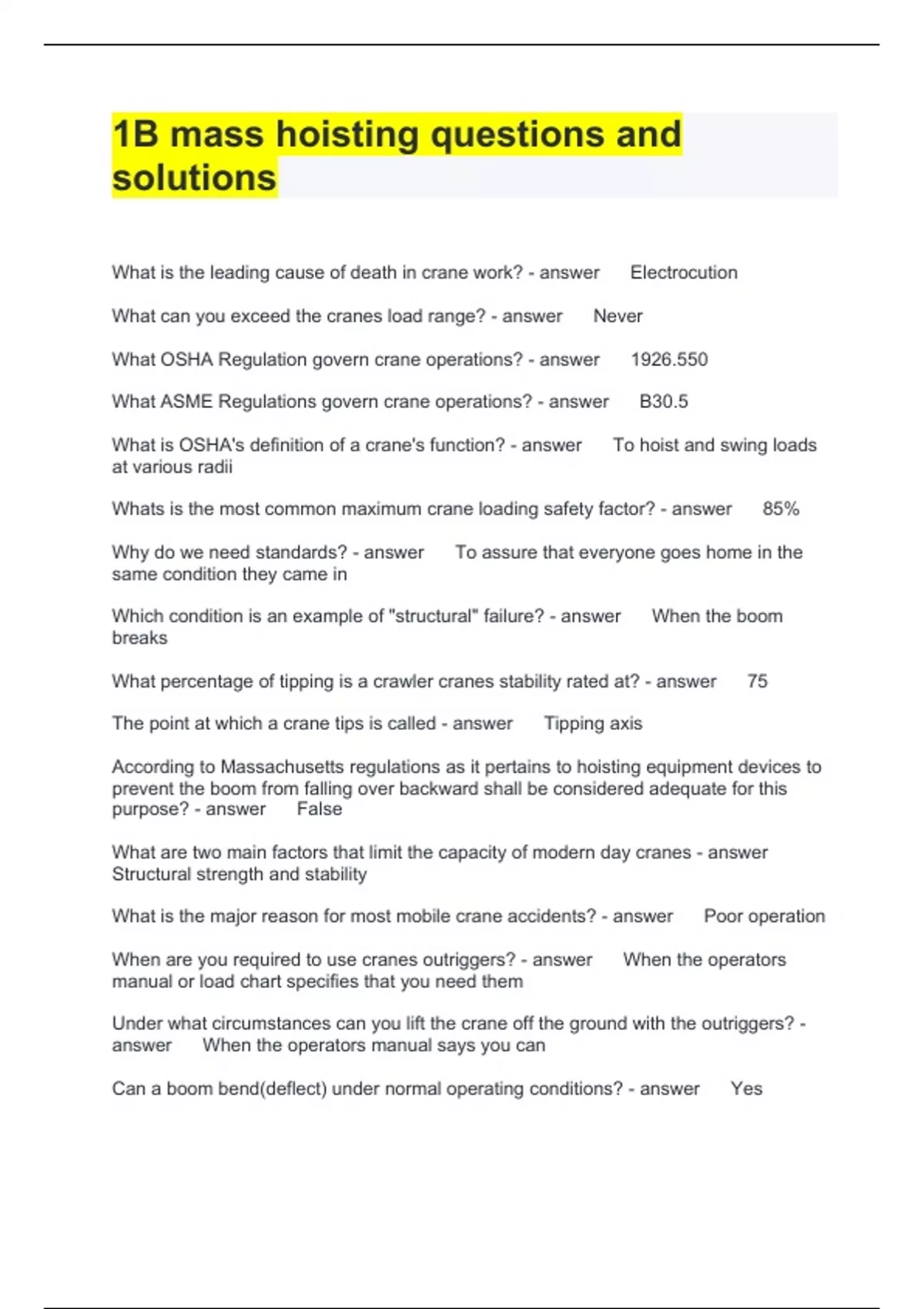 1B mass hoisting questions and solutions What is the leading cause of death in crane work? Electrocution What can you exceed the cranes load range? Never What OSHA Regulation govern crane operations? 1926.550 What ASME Regulations govern crane operations? B30.5 What is OSHA's definition of a crane's function? To hoist and swing loads at various radii Whats is the most common maximum crane loading safety factor? 85% Why do we need standards? To assure that everyone goes home in the same condition they came in Which condition is an example of "structural" failure? When the boom breaks What percentage of tipping is a crawler cranes stability rated at? 75 The point at which a crane tips is called Tipping axis According to Massachusetts regulations as it pertains to hoisting equipment devices to prevent the boom from falling over backward shall be considered adequate for this purpose? False What are two main factors that limit the capacity of modern day cranes Structural strength and stability What is the major reason for most mobile crane accidents? Poor operation When are you required to use cranes outriggers? When the operators manual or load chart specifies that you need them Under what circumstances can you lift the crane off the ground with the outriggers? When the operators manual says you can Can a boom bend(deflect) under normal operating conditions? Yes What does swing mean? To rotate the upper structure of the crane If a hydraulic hose ruptures, should you expect the boom to come crashing to the ground? No What is the minimum wraps of line that OSHA says that you must have on the drum? 2 What does a swing break do? It stops the upper structure from rotating According to Massachusetts regulations as it pertains to hosting equipment each crane shall be equipped with a mechanism which will cause the boom swing to be Started and stopped in a manner sufficiently gradual to prevent damaging effects of torsion on the crane It is not specifically required that an operator is to be protected with a cab when exposed to overhead hazards False What does it mean to two-block a crane To run the load block into the boom tip sheaves(upper block) The rated capacity of each load hook is Stamped on the hook What is one lay of rope? The length of rope measured by one turn of the strand What is the minimum number of broken wires that will condemn a running rope? 3 If a running rope gets crushed, is it out of service? Yes, Always How far can a hook twist before it gets condemned? 10% How big should a boom tip sheave be? 18 times the diameter of the rope If a load is lifted using a 4 point sling how much of the weight is carried on each leg? One third of the weight What's the basic rule of thumb when using wire rope clips? Never saddle a dead horse If a rope has a CBS of 15,000 lbs and a design safety factor of 5, what is it's capacity? 3,000 Lbs When attaching clips to a wire rope you should..... Never stagger the clips and ensure that the u-bolt of all clips are on the dead end of the wire rope What is the term called when the ultimate strength of an object is divided by the safe working load of that object? Safety factor A right regular lay rope is designed as one in which the Wires twist to the left and the strands twist to the right When shall wire rope be taken out of service that is used as running rope for hoisting 3 Broken wires in one strand in one rope lay When may chains be used as slings? The chains may only be used as slings so long as they are in accordance with 29 CFR 1926 Using undersized wire rope will Flatten the rope and cut a groove in the sheave A lang lay rope is designated as one in which the Wires and strands twist in the same direction