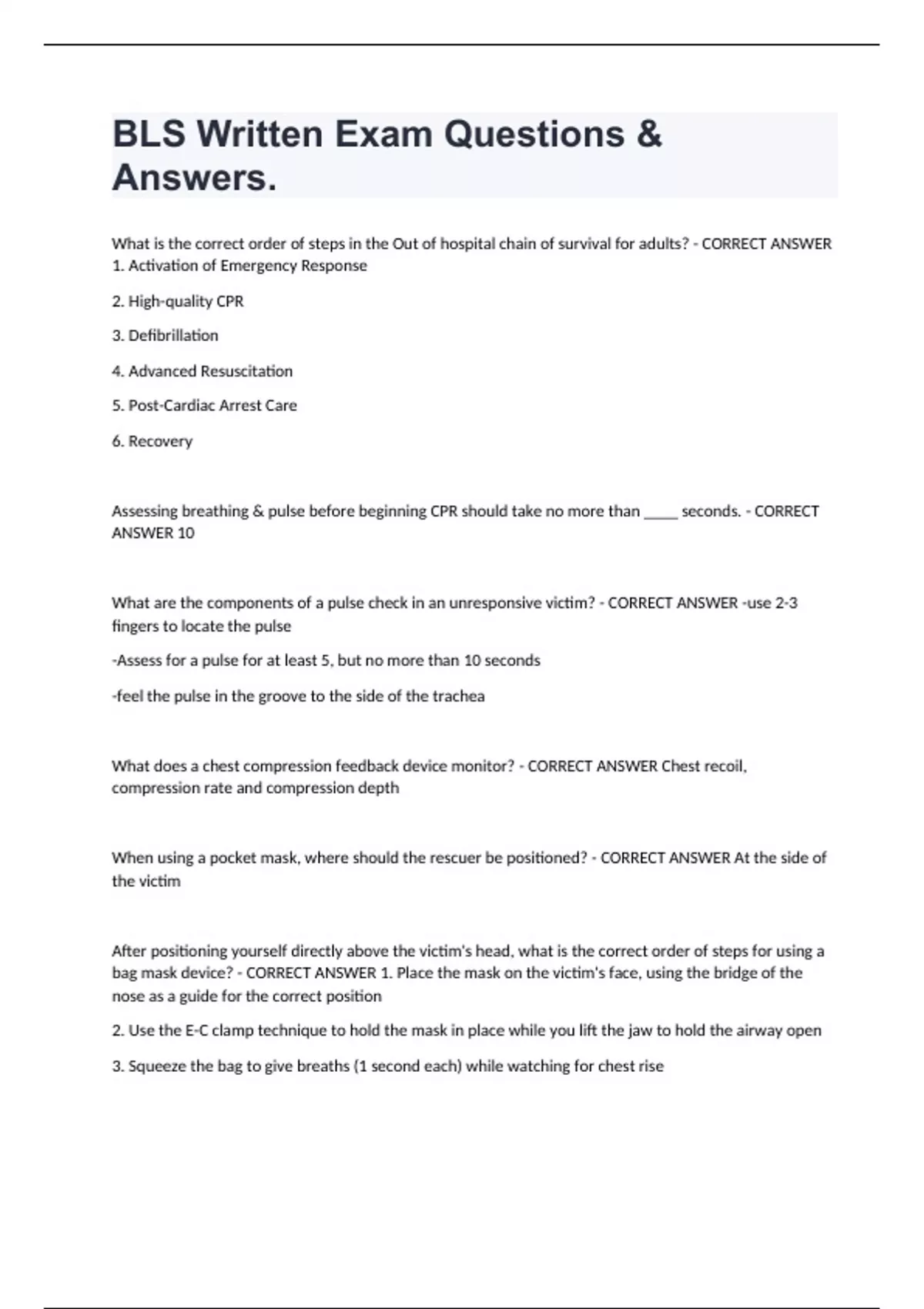BLS Written Exam Questions & Answers. What is the correct order of steps in the Out of hospital chain of survival for adults? - CORRECT ANSWER 1. Activation of Emergency Response 2. High-quality CPR 3. Defibrillation 4. Advanced Resuscitation 5. Post-Cardiac Arrest Care 6. Recovery Assessing breathing & pulse before beginning CPR should take no more than ____ seconds. - CORRECT ANSWER 10 What are the components of a pulse check in an unresponsive victim? - CORRECT ANSWER -use 2-3 fingers to locate the pulse -Assess for a pulse for at least 5, but no more than 10 seconds -feel the pulse in the groove to the side of the trachea What does a chest compression feedback device monitor? - CORRECT ANSWER Chest recoil, compression rate and compression depth When using a pocket mask, where should the rescuer be positioned? - CORRECT ANSWER At the side of the victim After positioning yourself directly above the victim's head, what is the correct order of steps for using a bag mask device? - CORRECT ANSWER 1. Place the mask on the victim's face, using the bridge of the nose as a guide for the correct position 2. Use the E-C clamp technique to hold the mask in place while you lift the jaw to hold the airway open 3. Squeeze the bag to give breaths (1 second each) while watching for chest rise Two life-threatening arrhythmias that can cause cardiac arrest are pulseless ventricular tachycardia and ___________________________ - CORRECT ANSWER Ventricular fibrillation