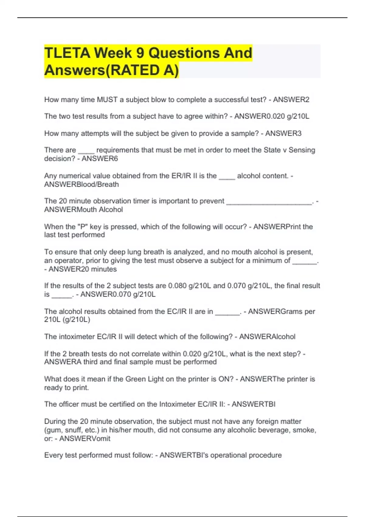 How many time MUST a subject blow to complete a successful test? - ANSWER2 The two test results from a subject have to agree within? - ANSWER0.020 g/210L How many attempts will the subject be given to provide a sample? - ANSWER3 There are ____ requirements that must be met in order to meet the State v Sensing decision? - ANSWER6 Any numerical value obtained from the ER/IR II is the ____ alcohol content. - ANSWERBlood/Breath The 20 minute observation timer is important to prevent _____________________. - ANSWERMouth Alcohol When the "P" key is pressed, which of the following will occur? - ANSWERPrint the last test performed To ensure that only deep lung breath is analyzed, and no mouth alcohol is present, an operator, prior to giving the test must observe a subject for a minimum of ______. - ANSWER20 minutes If the results of the 2 subject tests are 0.080 g/210L and 0.070 g/210L, the final result is _____. - ANSWER0.070 g/210L The alcohol results obtained from the EC/IR II are in ______. - ANSWERGrams per 210L (g/210L) The intoximeter EC/IR II will detect which of the following? - ANSWERAlcohol If the 2 breath tests do not correlate within 0.020 g/210L, what is the next step? - ANSWERA third and final sample must be performed What does it mean if the Green Light on the printer is ON? - ANSWERThe printer is ready to print. The officer must be certified on the Intoximeter EC/IR II: - ANSWERTBI During the 20 minute observation, the subject must not have any foreign matter (gum, snuff, etc.) in his/her mouth, did not consume any alcoholic beverage, smoke, or: - ANSWERVomit Every test performed must follow: - ANSWERTBI's operational procedure