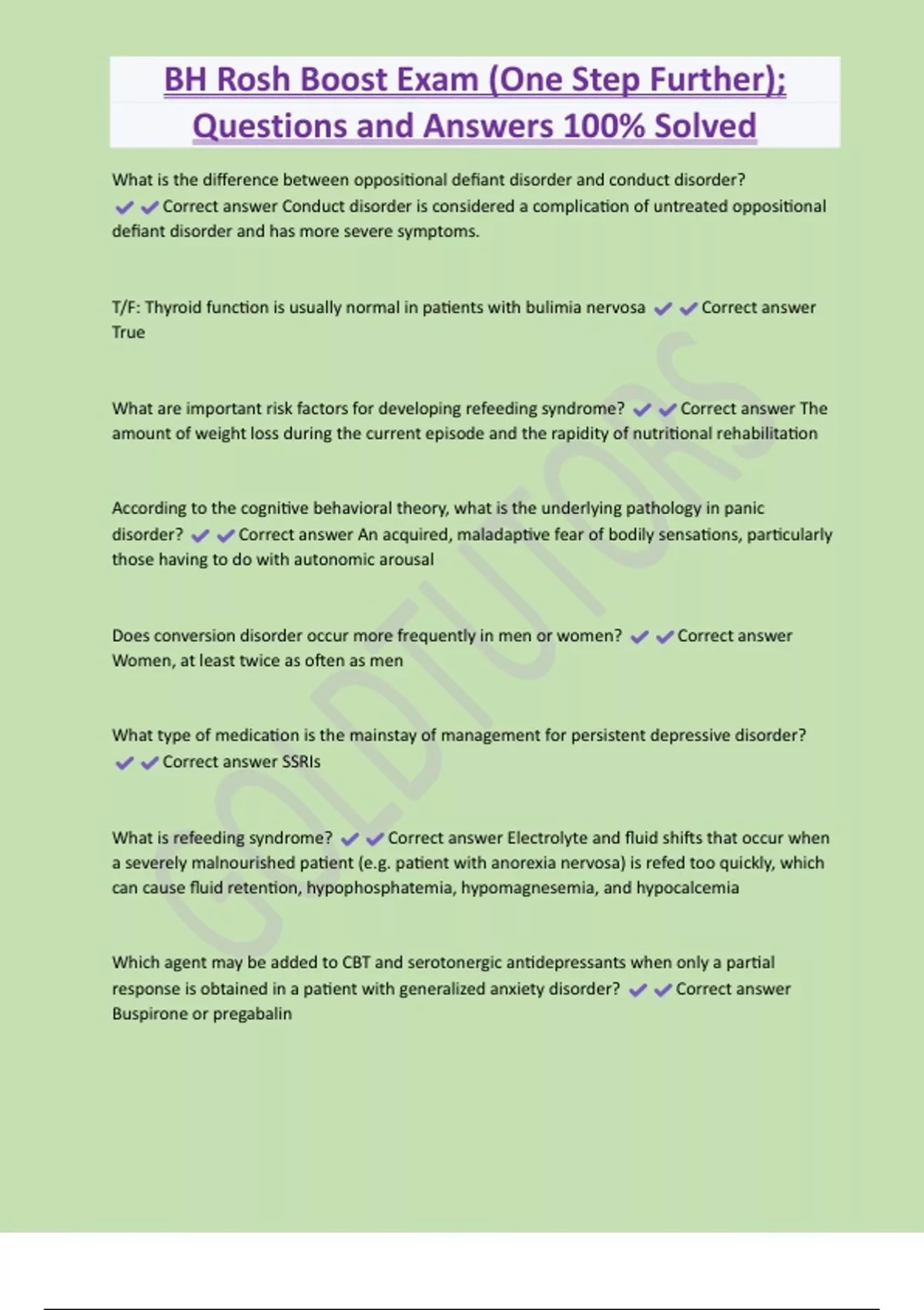 BH Rosh Boost Exam (One Step Further); Questions and Answers 100% Solved What is the difference between oppositional defiant disorder and conduct disorder? Correct answer Conduct disorder is considered a complication of untreated oppositional defiant disorder and has more severe symptoms. T/F: Thyroid function is usually normal in patients with bulimia nervosa Correct answer True What are important risk factors for developing refeeding syndrome? Correct answer The amount of weight loss during the current episode and the rapidity of nutritional rehabilitation