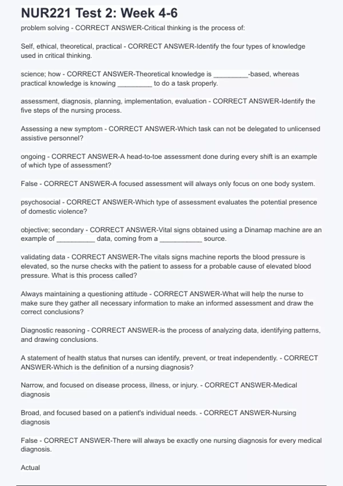 nursing assessment - CORRECT ANSWER-Nursing diagnosis is always a result of the: