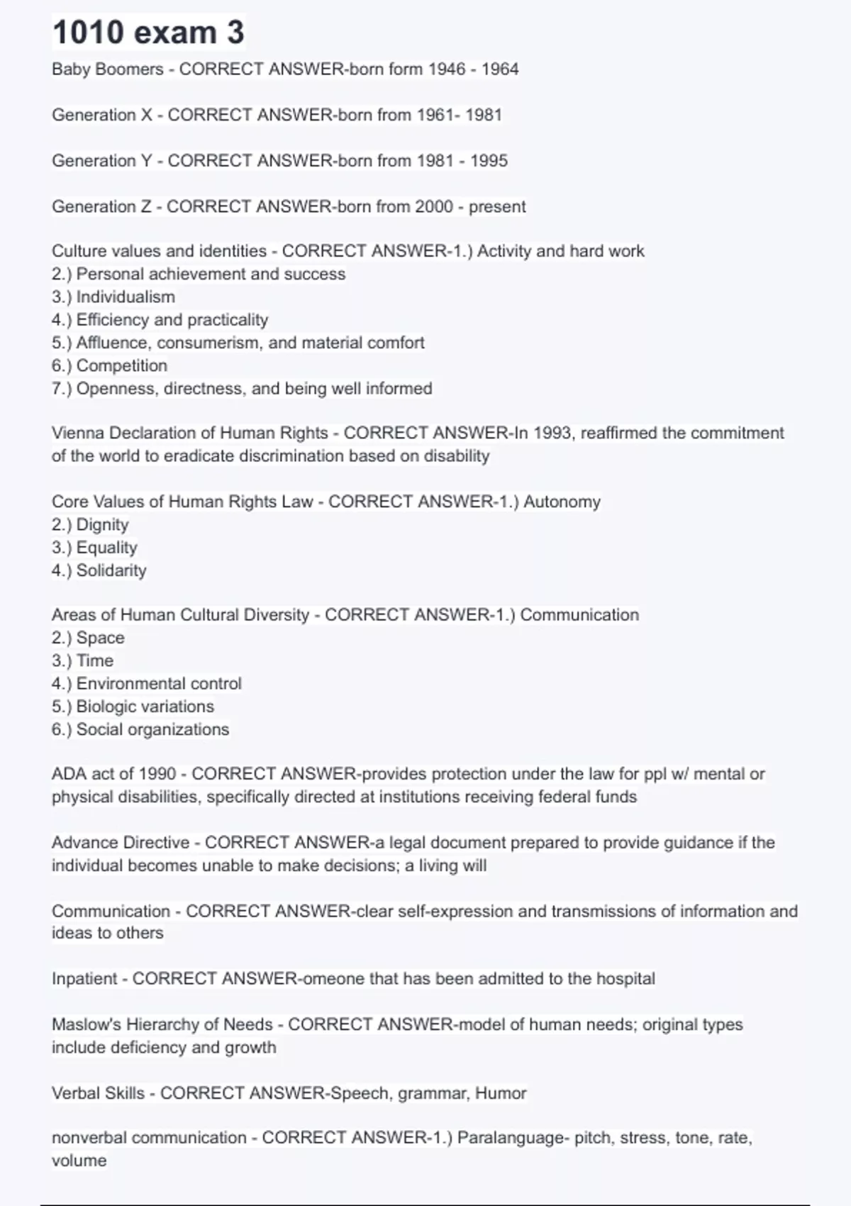 Areas of Human Cultural Diversity - CORRECT ANSWER-1.) Communication