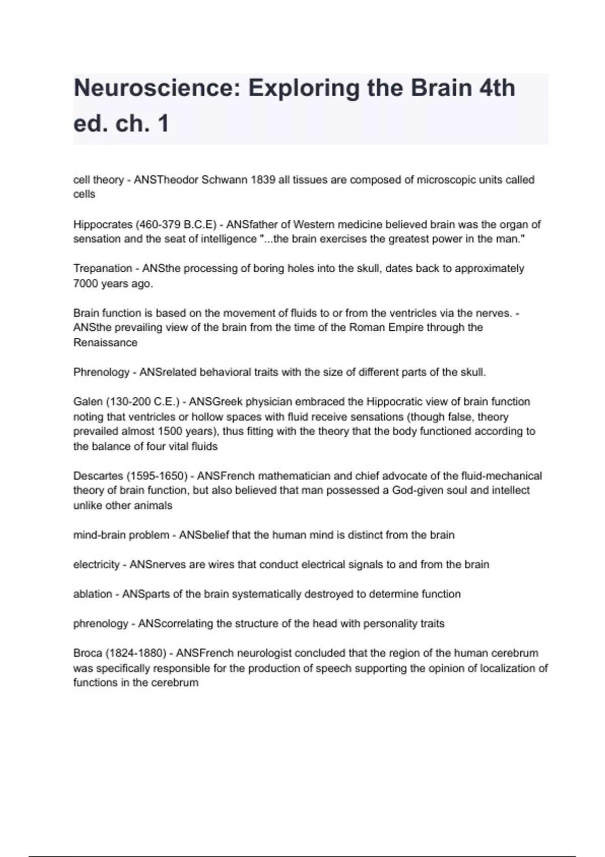 Neuroscience: Exploring the Brain 4th ed. ch. 1 Test bank