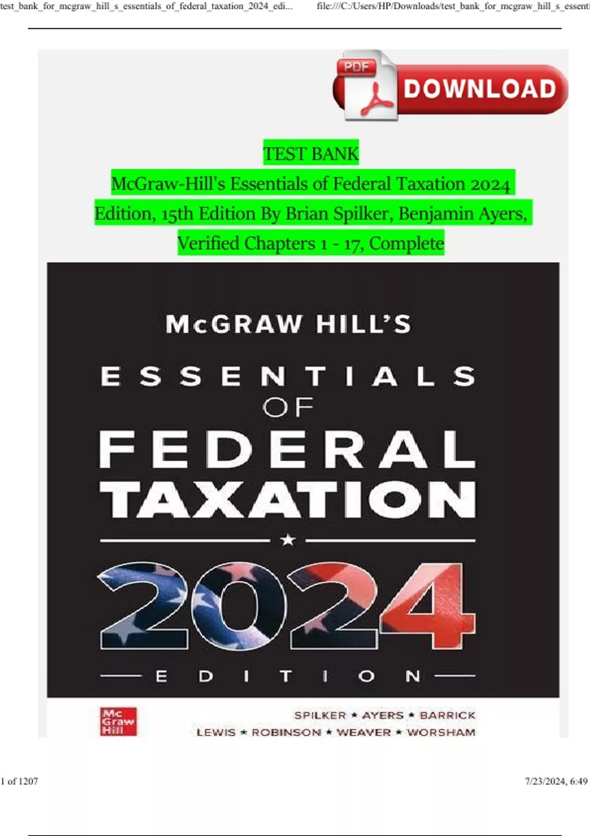 TEST BANK For McGraw-Hill's Essentials of Federal Taxation 2024 Edition, 15th Edition By Brian Spilker, Benjamin Ayers, Verified Chapters 1 - 17, Complete Latest Version 2024 ISBN: 9781265364656
