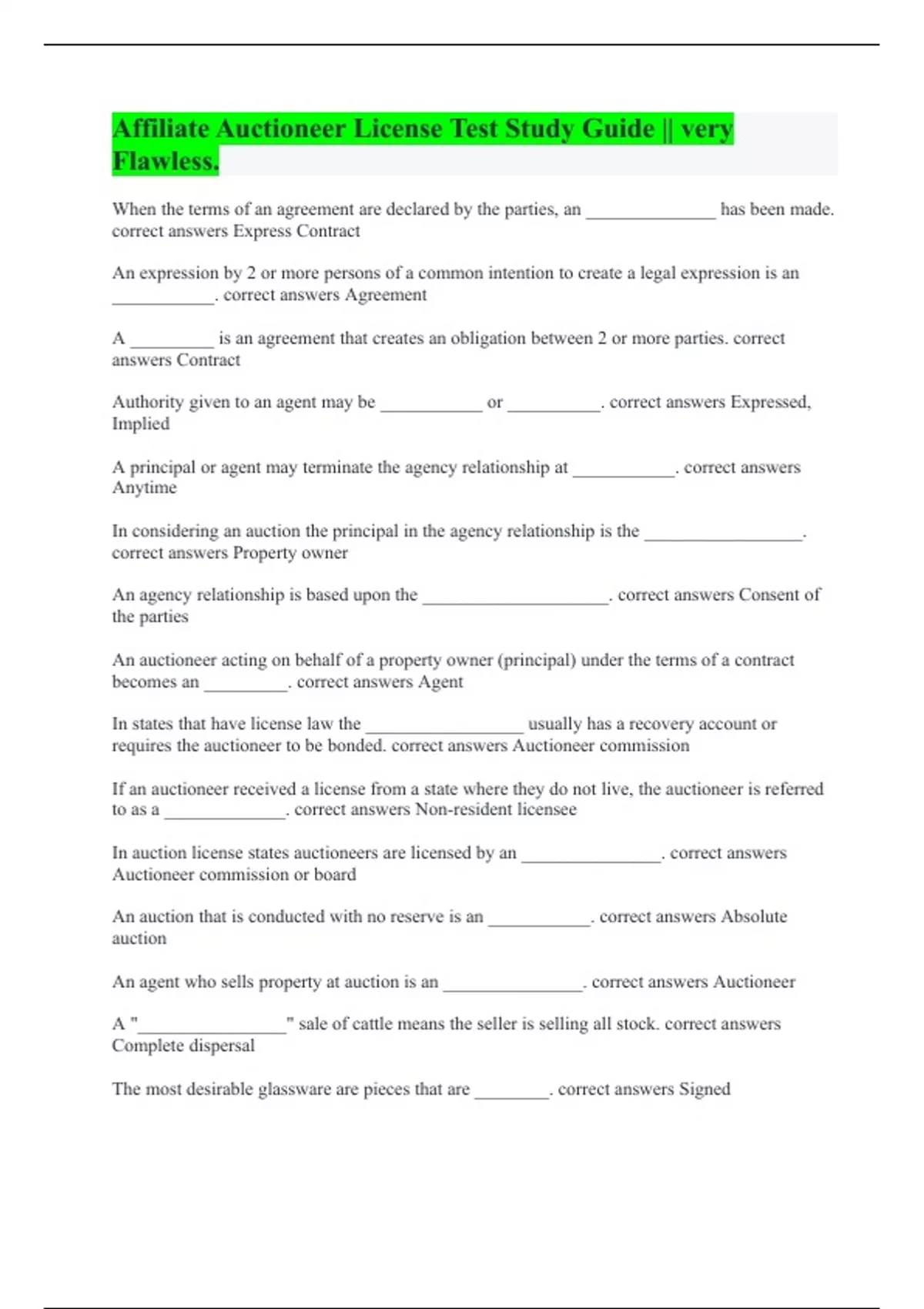 When the terms of an agreement are declared by the parties, an ______________ has been made. correct answers Express Contract An expression by 2 or more persons of a common intention to create a legal expression is an ___________. correct answers Agreement A _________ is an agreement that creates an obligation between 2 or more parties. correct answers Contract Authority given to an agent may be ___________ or __________. correct answers Expressed, Implied A principal or agent may terminate the agency relationship at ___________. correct answers Anytime In considering an auction the principal in the agency relationship is the _________________. correct answers Property owner An agency relationship is based upon the ____________________. correct answers Consent of the parties An auctioneer acting on behalf of a property owner (principal) under the terms of a contract becomes an _________. correct answers Agent In states that have license law the _________________ usually has a recovery account or requires the auctioneer to be bonded. correct answers Auctioneer commission If an auctioneer received a license from a state where they do not live, the auctioneer is referred to as a _____________. correct answers Non-resident licensee In auction license states auctioneers are licensed by an _______________. correct answers Auctioneer commission or board An auction that is conducted with no reserve is an ___________. correct answers Absolute auction An agent who sells property at auction is an _______________. correct answers Auctioneer A "________________" sale of cattle means the seller is selling all stock. correct answers Complete dispersal The most desirable glassware are pieces that are ________. correct answers Signed