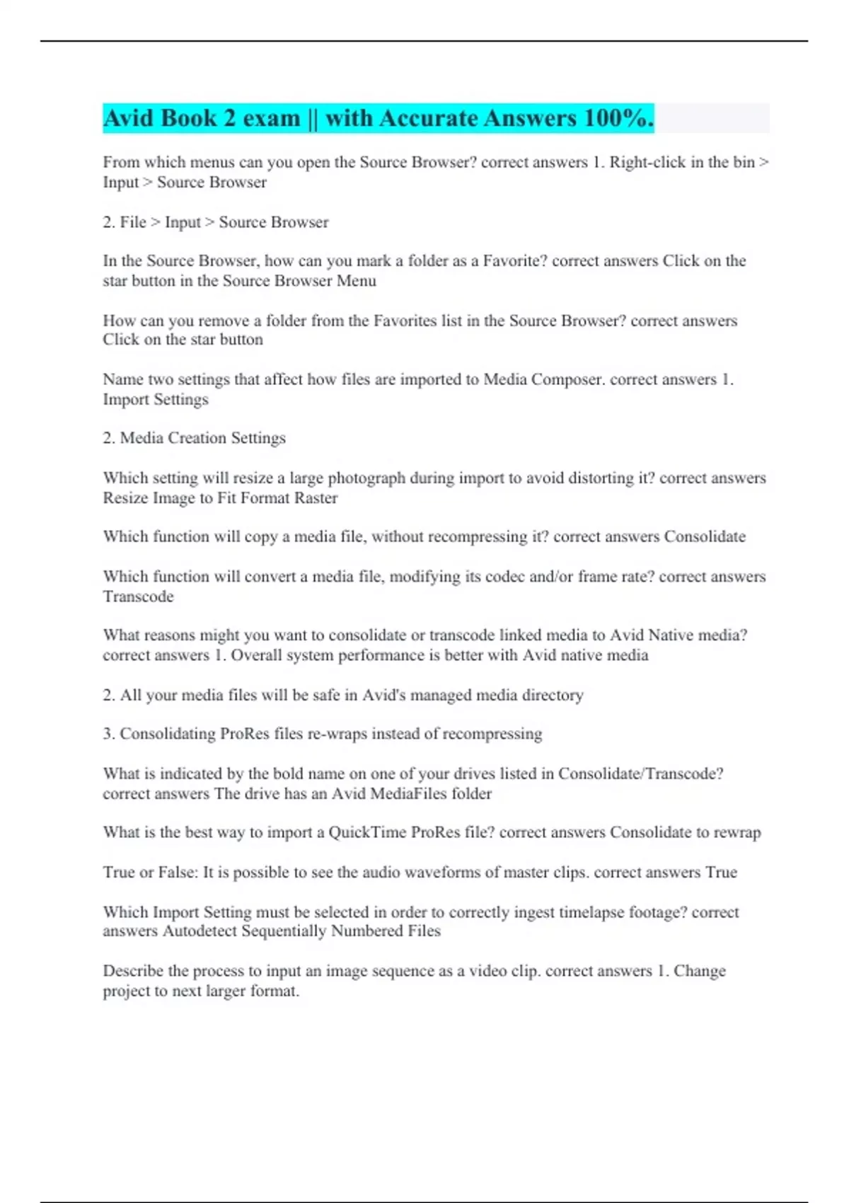 From which menus can you open the Source Browser? correct answers 1. Right-click in the bin Input Source Browser 2. File Input Source Browser In the Source Browser, how can you mark a folder as a Favorite? correct answers Click on the star button in the Source Browser Menu How can you remove a folder from the Favorites list in the Source Browser? correct answers Click on the star button Name two settings that affect how files are imported to Media Composer. correct answers 1. Import Settings 2. Media Creation Settings Which setting will resize a large photograph during import to avoid distorting it? correct answers Resize Image to Fit Format Raster Which function will copy a media file, without recompressing it? correct answers Consolidate Which function will convert a media file, modifying its codec and/or frame rate? correct answers Transcode What reasons might you want to consolidate or transcode linked media to Avid Native media? correct answers 1. Overall system performance is better with Avid native media 2. All your media files will be safe in Avid's managed media directory 3. Consolidating ProRes files re-wraps instead of recompressing What is indicated by the bold name on one of your drives listed in Consolidate/Transcode? correct answers The drive has an Avid MediaFiles folder What is the best way to import a QuickTime ProRes file? correct answers Consolidate to rewrap True or False: It is possible to see the audio waveforms of master clips. correct answers True Which Import Setting must be selected in order to correctly ingest timelapse footage? correct answers Autodetect Sequentially Numbered Files Describe the process to input an image sequence as a video clip. correct answers 1. Change project to next larger format.