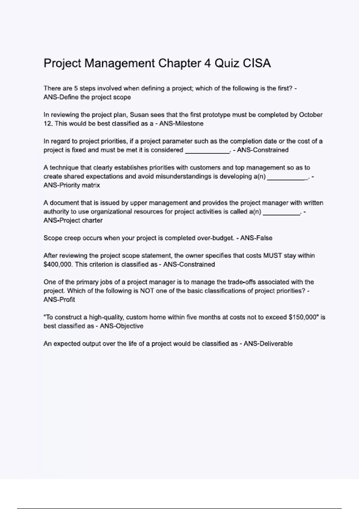 project management chapter 4 quiz cisa