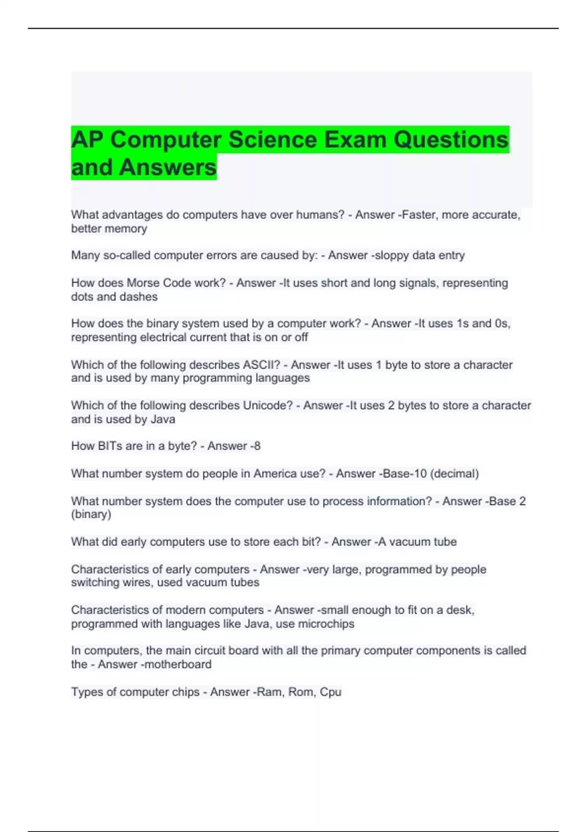 AP Computer Science Exam Questions and Answers