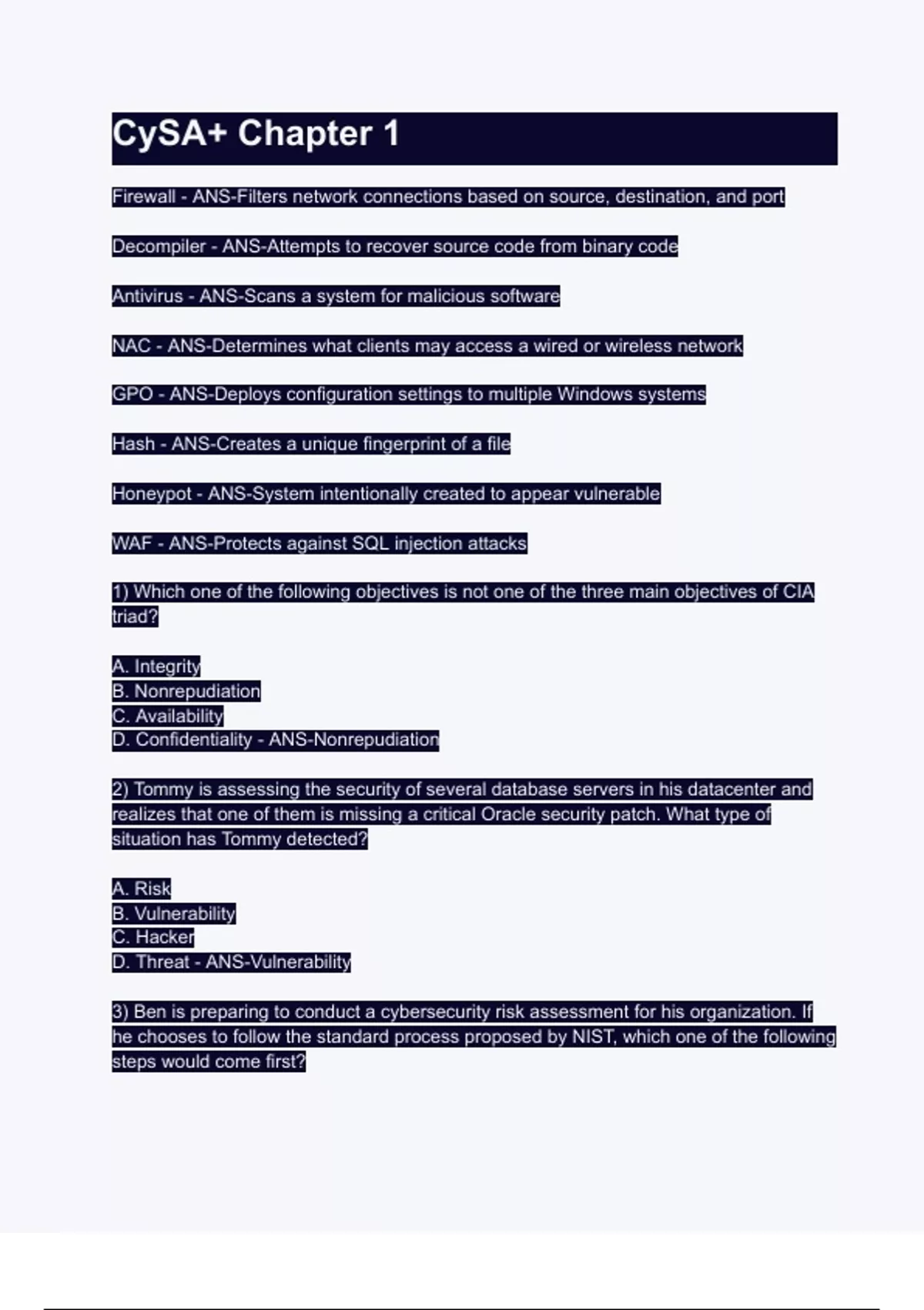 Exam of 8 pages for the course CySA+ at CySA+ (CySA+ Chapter 1 (1)