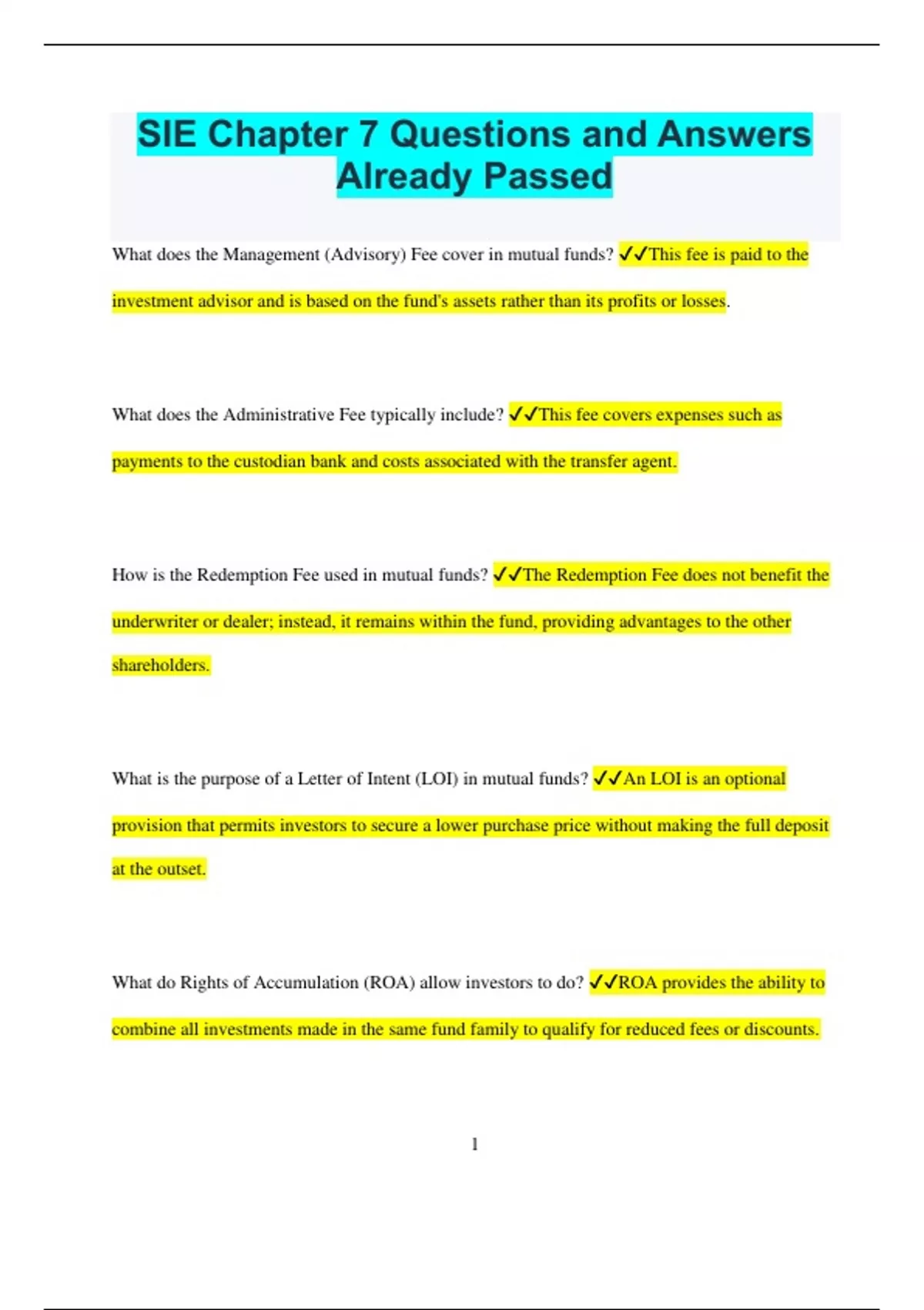 SIE Chapter 7 Questions and Answers Already Passed What does the Management (Advisory) Fee cover in mutual funds? This fee is paid to the investment advisor and is based on the fund's assets rather than its profits or losses. What does the Administrative Fee typically include? This fee covers expenses such as payments to the custodian bank and costs associated with the transfer agent. How is the Redemption Fee used in mutual funds? The Redemption Fee does not benefit the underwriter or dealer; instead, it remains within the fund, providing advantages to the other shareholders. What is the purpose of a Letter of Intent (LOI) in mutual funds? An LOI is an optional provision that permits investors to secure a lower purchase price without making the full deposit at the outset. What do Rights of Accumulation (ROA) allow investors to do? ROA provides the ability to combine all investments made in the same fund family to qualify for reduced fees or discounts. 2 What is Dollar Cost Averaging (DCA) and how does it work? DCA is an investment strategy where the investor regularly invests a fixed amount of money into a fund, regardless of the share price, over a set period. What are Withdrawal Plans in the context of mutual funds? Withdrawal Plans enable investors to receive scheduled, periodic payments from their investment accounts. What does a Face Amount Certificate Company (FAC) do? FACs issue debt certificates where the issuer guarantees the face value at maturity or a surrender value if the certificate is redeemed before maturity. What characterizes a Unit Investment Trust Company? A Unit Investment Trust Company operates under supervision rather than active management, and its portfolio typically remains unchanged throughout the trust's duration. What are the features of Class A Shares in mutual funds? Class A Shares usually come with an initial front-end load and often have minimal or no 12b-1 fees. 3 How do Class B Shares differ from Class A Shares? Class B Shares typically involve a contingent deferred sales charge if sold within a specified period and usually have higher 12b-1 fees compared to Class A Shares. What are the characteristics of Class C Shares in mutual funds? Class C Shares generally have an upfront sales charge, commonly