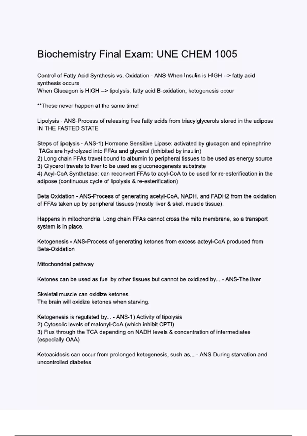 Biochemistry Final Exam UNE CHEM 1005
