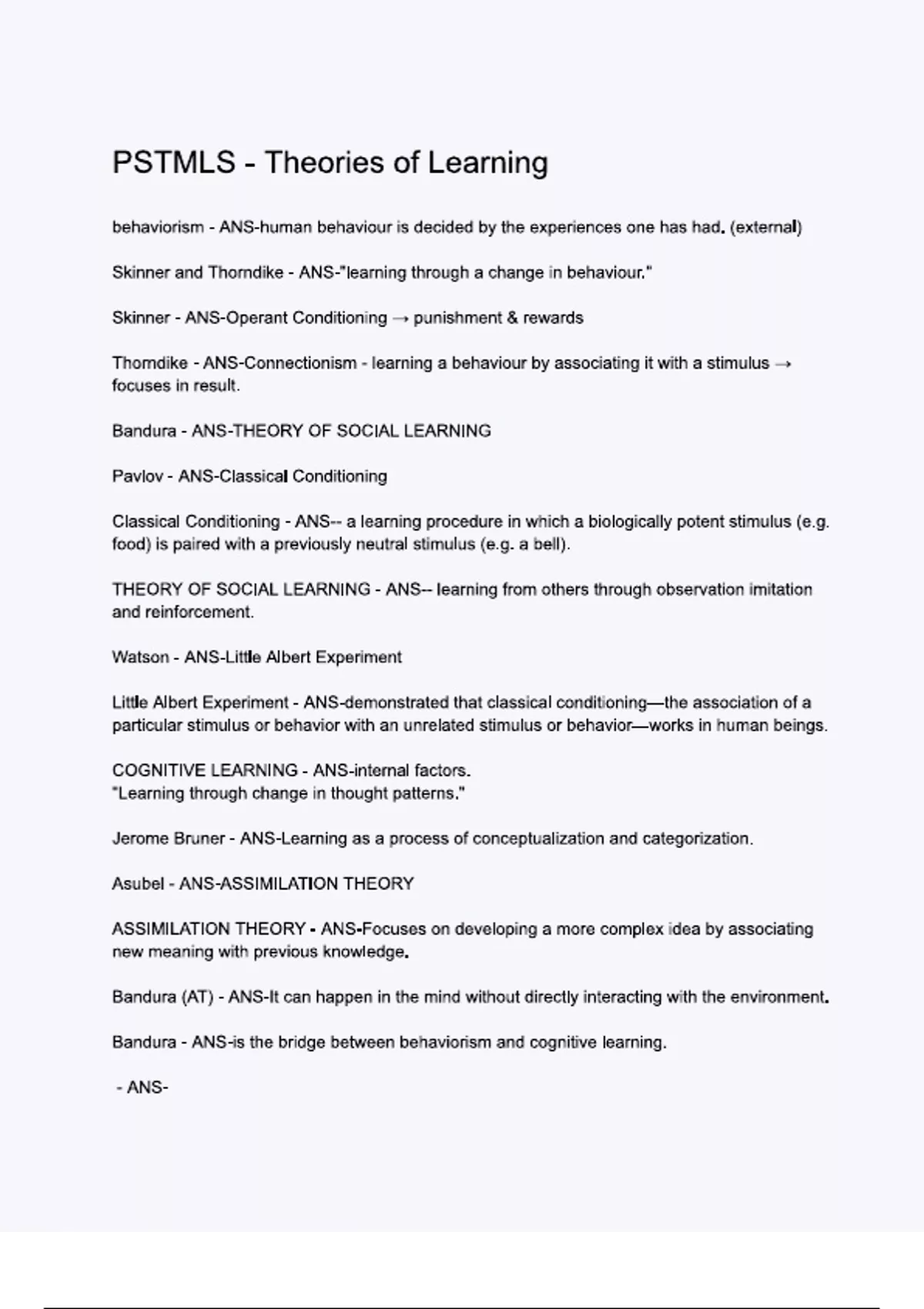 PSTMLS - Theories of Learning Questions & 100% Verified Correct Answers with complete solutions (Latest update
