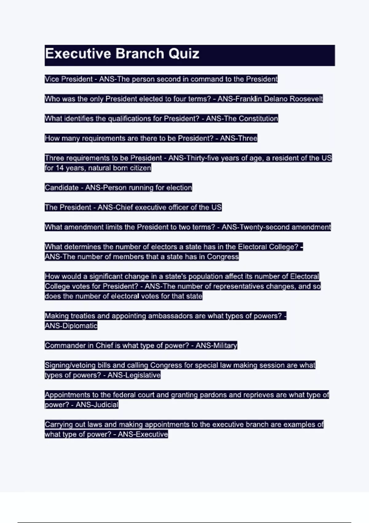 Executive Branch Quiz