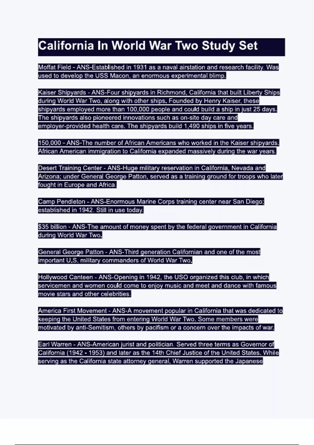 california in world war two study se