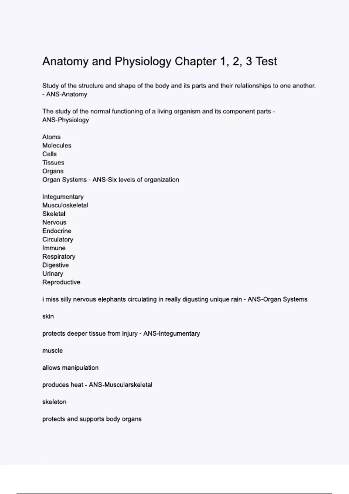 Anatomy and Physiology Chapter 1, 2, 3 Test.