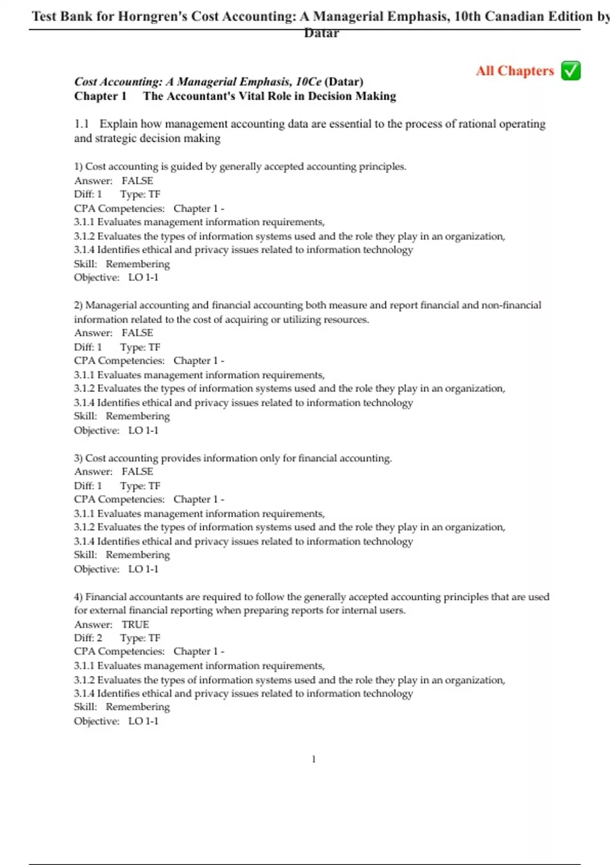 Test Bank for Horngren's Cost Accounting: A Managerial Emphasis, 10ce 10th Canadian Edition by Srikant M. Datar, Madhav V. Rajan, Louis Beaubien. Full Chapters (Chapter 1 to 23)test bank are included with answers. The Accountant's Vital Role in Decision Making An Introduction to Cost Terms and Purposes Cost–Volume–Profit Analysis Job Costing Activity-Based Costing and Management Master Budget and Responsibility Accounting Flexible Budgets, Variances, and Management Control: I Flexible Budgets, Variances, and Management Control: II Income Effects of Denominator Level on Inventory Valuation Analysis of Cost Behaviour Decision Making and Relevant Information Data Analytic Thinking and Prediction Pricing Decisions: Profitability and Cost Management Strategy, the Balanced Scorecard, and Profitability Analysis Period Cost Application Cost Allocation: Joint Products and Byproducts Revenue and Customer Profitability Analysis Process Costing Spoilage, Rework, and Scrap Inventory Cost Management Strategies Capital Budgeting: Methods of Investment Analysis Transfer Pricing and Multinational Management Control Systems Multinational Performance Measurement and Compensation