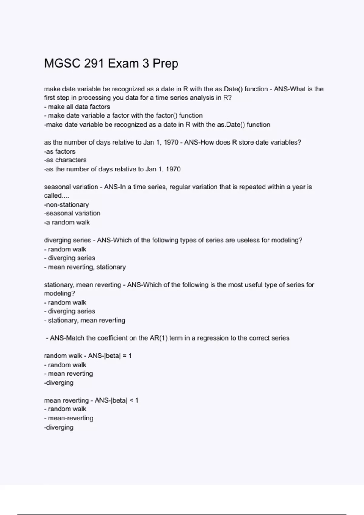 stationary, mean reverting - ANS-Which of the following is the most useful type of series for