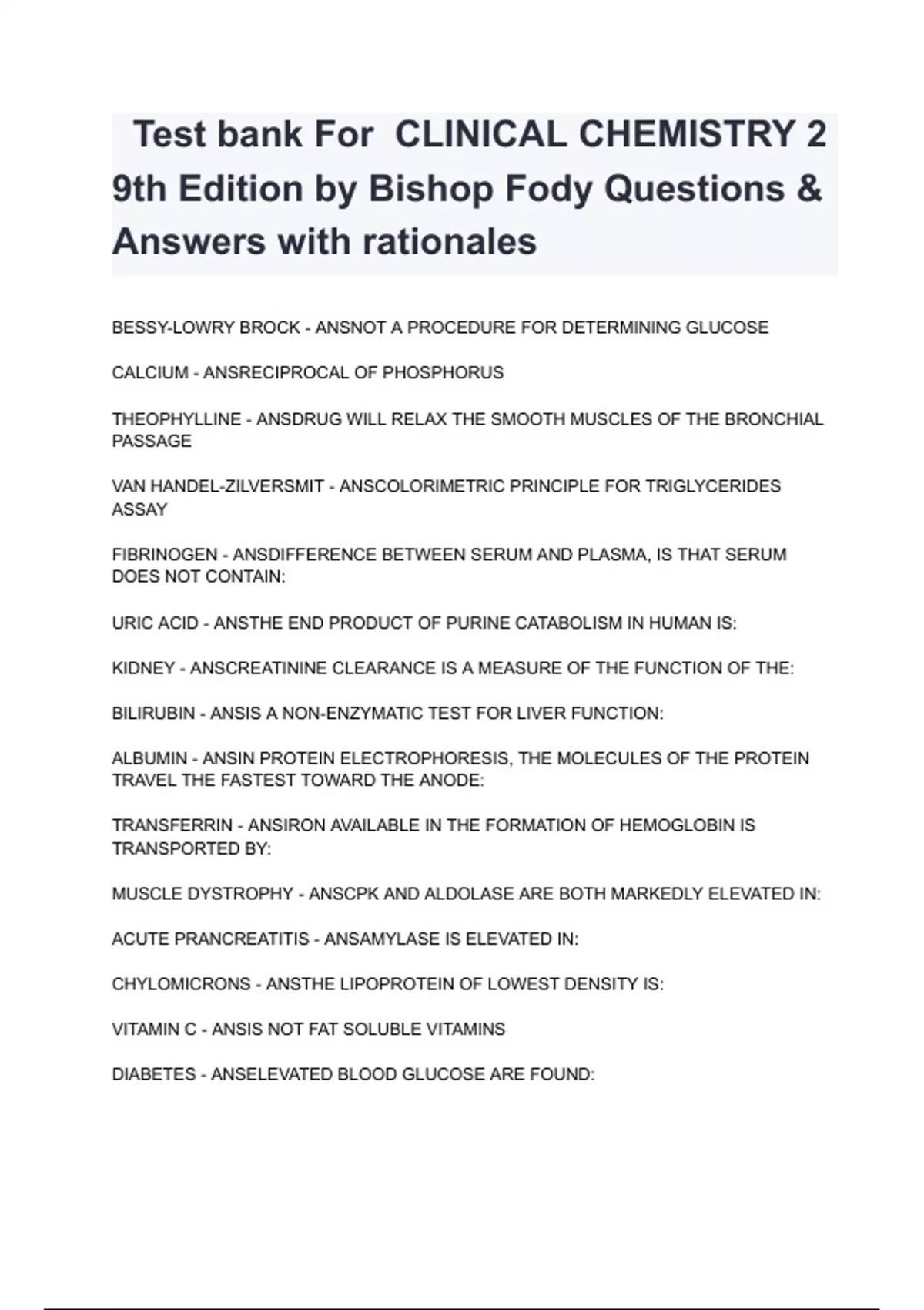 Test bank For CLINICAL CHEMISTRY 2 9th Edition by Bishop Fody Questions & Answers with rationales