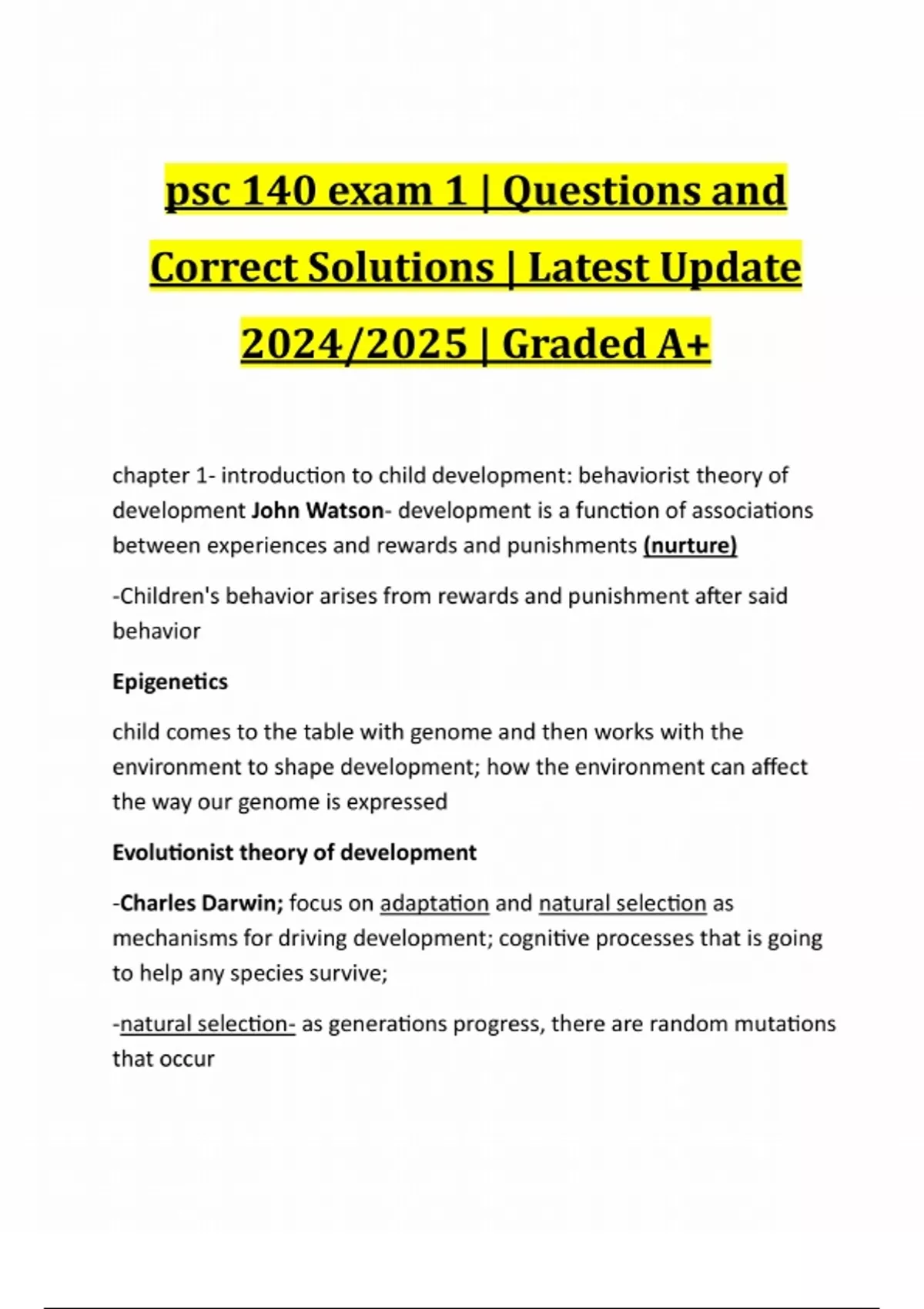 psc 140 exam 1 | Questions and Correct Solutions | Latest Update 2024/2025 | Graded A+ chapter 1- introduction to child development: behaviorist theory of development John Watson- development is a function of associations between experiences and rewards and punishments (nurture) -Children's behavior arises from rewards and punishment after said behavior Epigenetics child comes to the table with genome and then works with the environment to shape development; how the environment can affect the way our genome is expressed Evolutionist theory of development -Charles Darwin; focus on adaptation and natural selection as mechanisms for driving development; cognitive processes that is going to help any species survive; -natural selection- as generations progress, there are random mutations that occurif they support the overall fitness of an organism, that organism is more likely to pass down their genetic information to the next generation Psychoanalytic theory of development -Freud proposed the psychological drive is important in development; early experience plays an important role in shaping development - Stage theories of development Piaget’s cognitive development: development of thinking and reasoning Ex. According to Piaget’s theory, 2- to 5-year-olds are in a stage of development in which they can focus on only one aspect of an event, or one type of information, at a time. By age 7, children enter a different stage, in which they can simultaneo