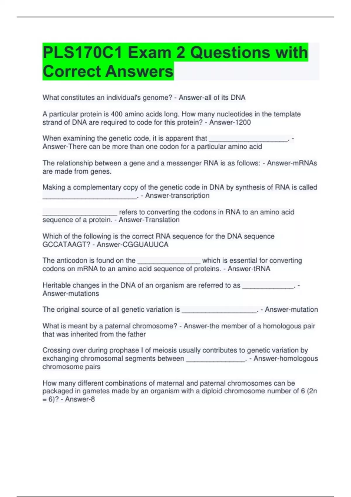 PLS170C1 Exam 2 Questions with Correct Answers What constitutes an individual's genome? - Answer-all of its DNA A particular protein is 400 amino acids long. How many nucleotides in the template strand of DNA are required to code for this protein? - Answer-1200 When examining the genetic code, it is apparent that ____________________. - Answer-There can be more than one codon for a particular amino acid The relationship between a gene and a messenger RNA is as follows: - Answer-mRNAs are made from genes. Making a complementary copy of the genetic code in DNA by synthesis of RNA is called ________________________. - Answer-transcription ___________________ refers to converting the codons in RNA to an amino acid sequence of a protein. - Answer-Translation Which of the following is the correct RNA sequence for the DNA sequence GCCATAAGT? - Answer-CGGUAUUCA The anticodon is found on the ________________ which is essential for converting codons on mRNA to an amino acid sequence of proteins. - Answer-tRNA Heritable changes in the DNA of an organism are referred to as _____________. - Answer-mutations The original source of all genetic variation is ___________________. - Answer-mutation What is meant by a paternal chromosome? - Answer-the member of a homologous pair that was inherited from the father Crossing over during prophase I of meiosis usually contributes to genetic variation by exchanging chromosomal segments between _______________. - Answer-homologous chromosome pairs